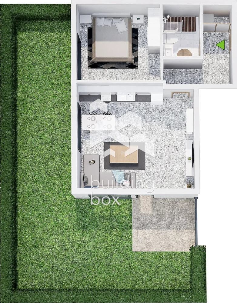 - РАЗПРЕДЕЛЕНИЕ: Просторна всекидневна с кухненски бокс с площ от 25,30 кв.м, спалня, баня с тоалетна и двор.