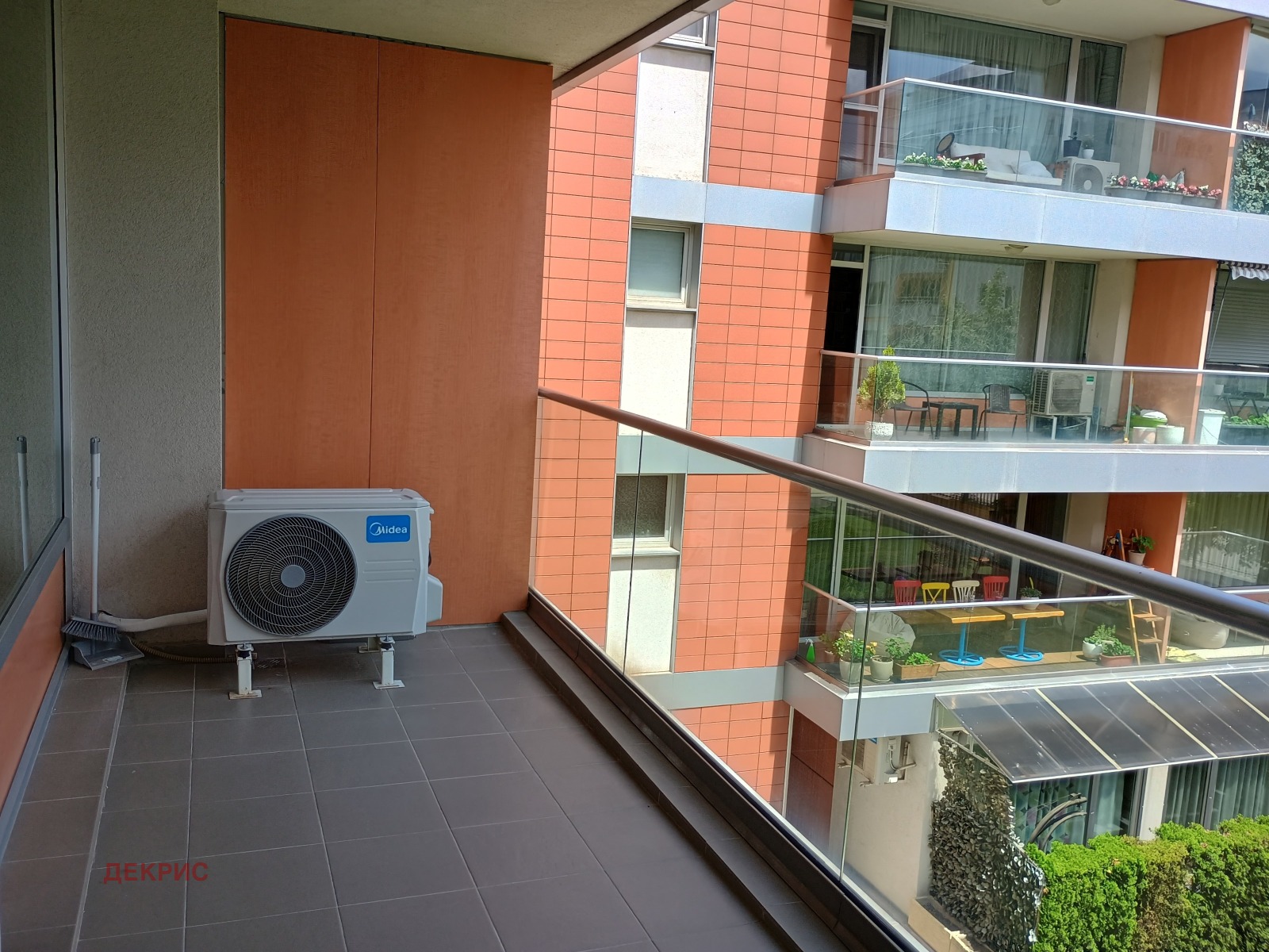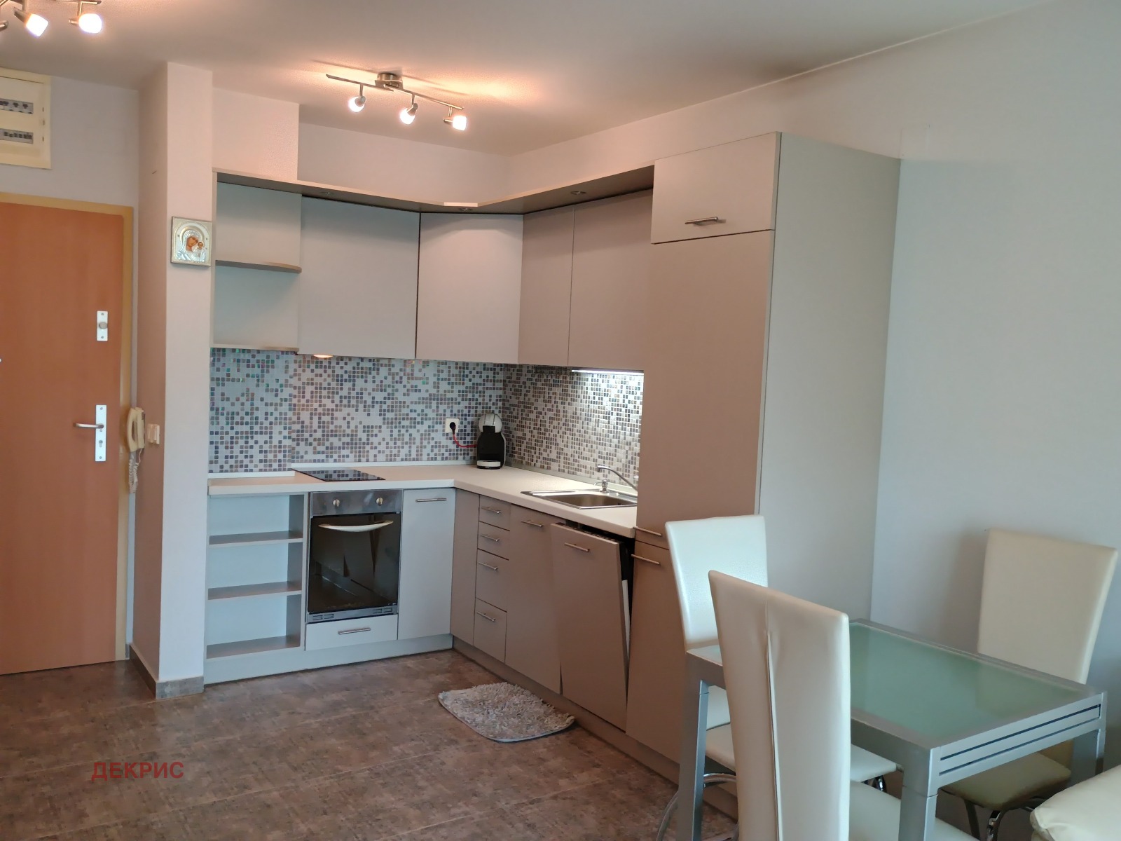 В цената е включено ПАРКОМЯСТО и таксата за комплекса. Жилището е в идеално състояние - след основно почистване . Има голяма дневна с кухненски бокс и трапезария, една спалня и баня с тоалетна . Вградена кухня с електроуреди ,има керамична плоча котлони,хладилник с фризер, миялна, пералня ,фурна за готвене. В спалнята има гардеробна и голямо легло . Леглото има чекмеджета за багаж. Мека мебел. Климатик. Луксозна баня с душкабина. Хубава тераса със столчета и масичка. Отопление много икономично - на газ с индивидуален газов котел. Намира се на тихо и спокойно място в затворен комплекс Буена Виста, с добре поддържани общи части и 24-часови видеонаблюдение. Има асансьор. Наемната цена включва ползването на ПАРКОМЯСТО в подземния гараж на сградата.