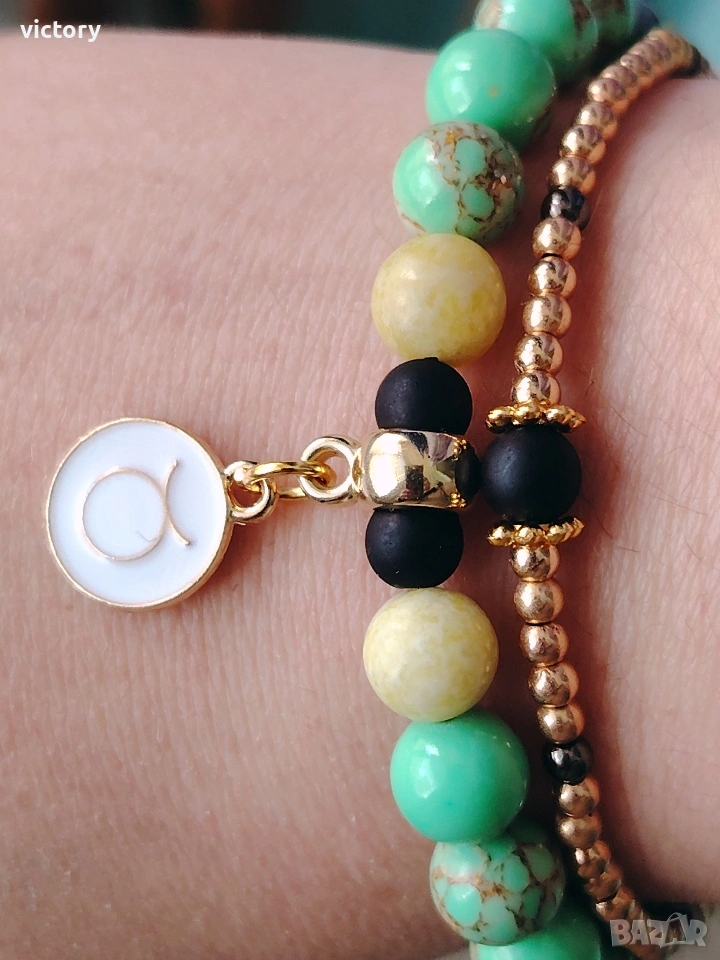 Ръчно изработена гривна, вдъхновена от силата и спокойствието на зодия Телец. Съчетава естествени камъни, които носят баланс, стабилност и вътрешна хармония: ✨ Тюркоаз – защита и спокойствие ✨ Жадеит – късмет и мекота ✨ Обсидиан – сила и заземяване Финият златист акцент и символът на Телец придават елегантност и лично значение. 💫 Подходяща за: – подарък със смисъл – хора, родени под знака на Телец – всеки, който търси баланс и стил в едно ✔️ Ръчна изработка ✔️ Регулируем размер ✔️ Уникален дизайн 🎁 Готова за подарък #телец #ръчноизработено #гривна #естественикристали #подарък #handmade