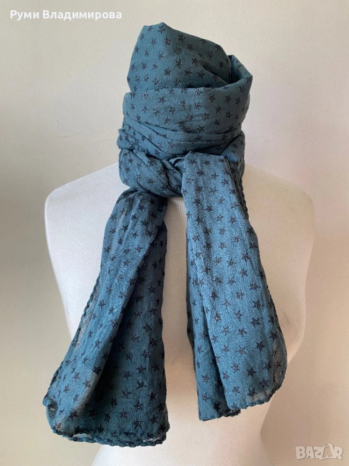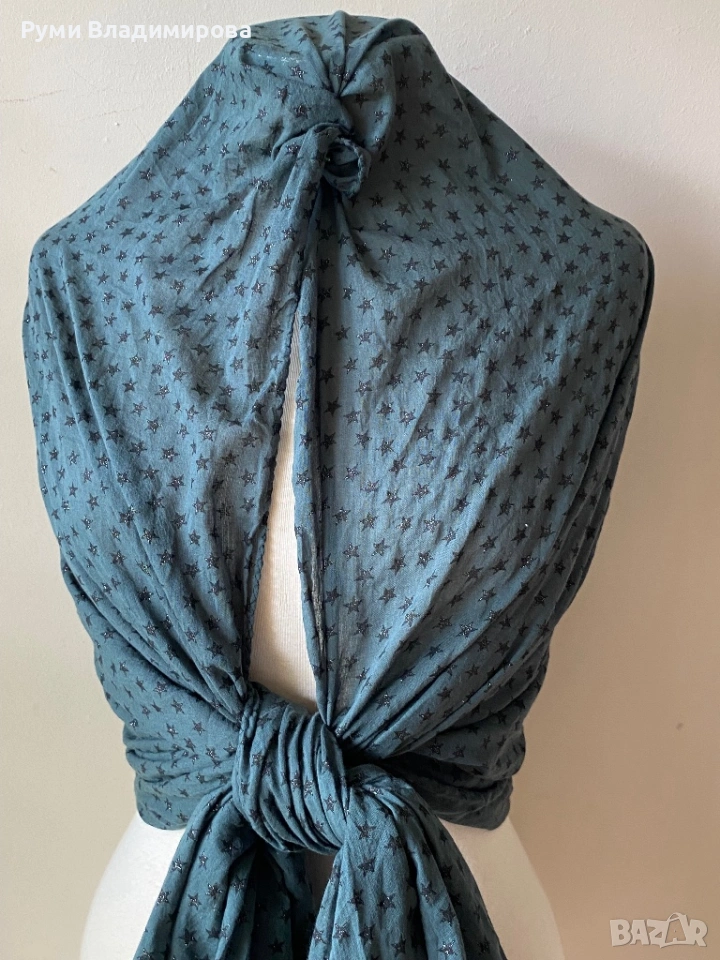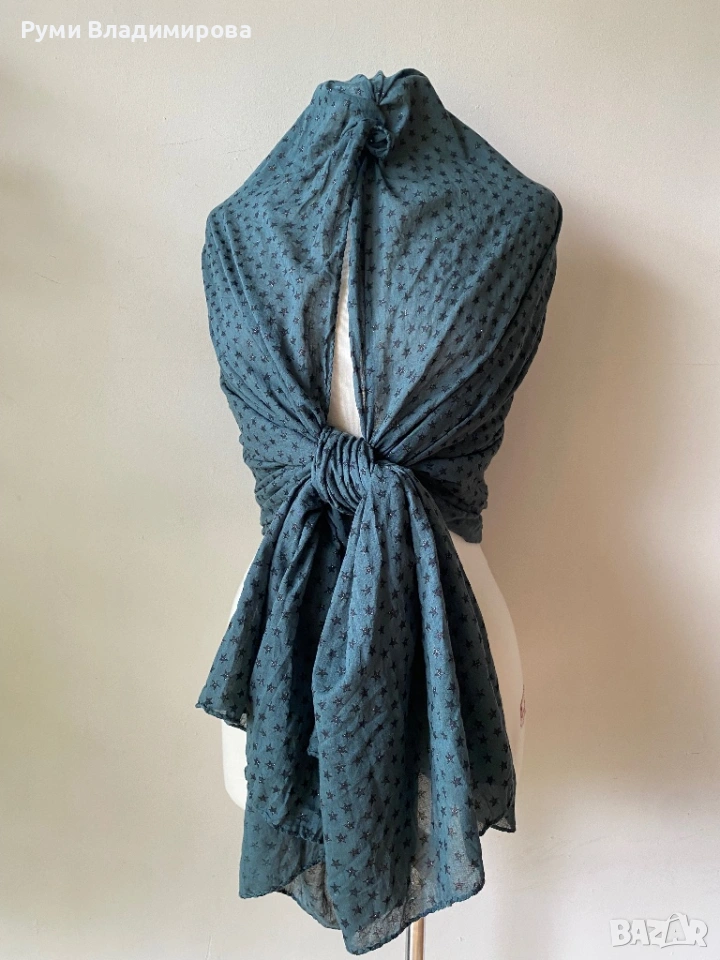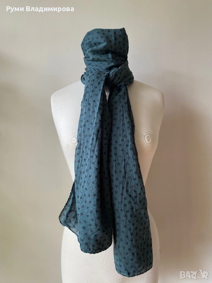 Тъмнозелен шал на блестящи черни звездички Beck Sondergaard от 100 % памук, тънка, прозираща материя, може да се използва и за летен аксесоар, голям размер, доставка с Еконт, цена 15€.