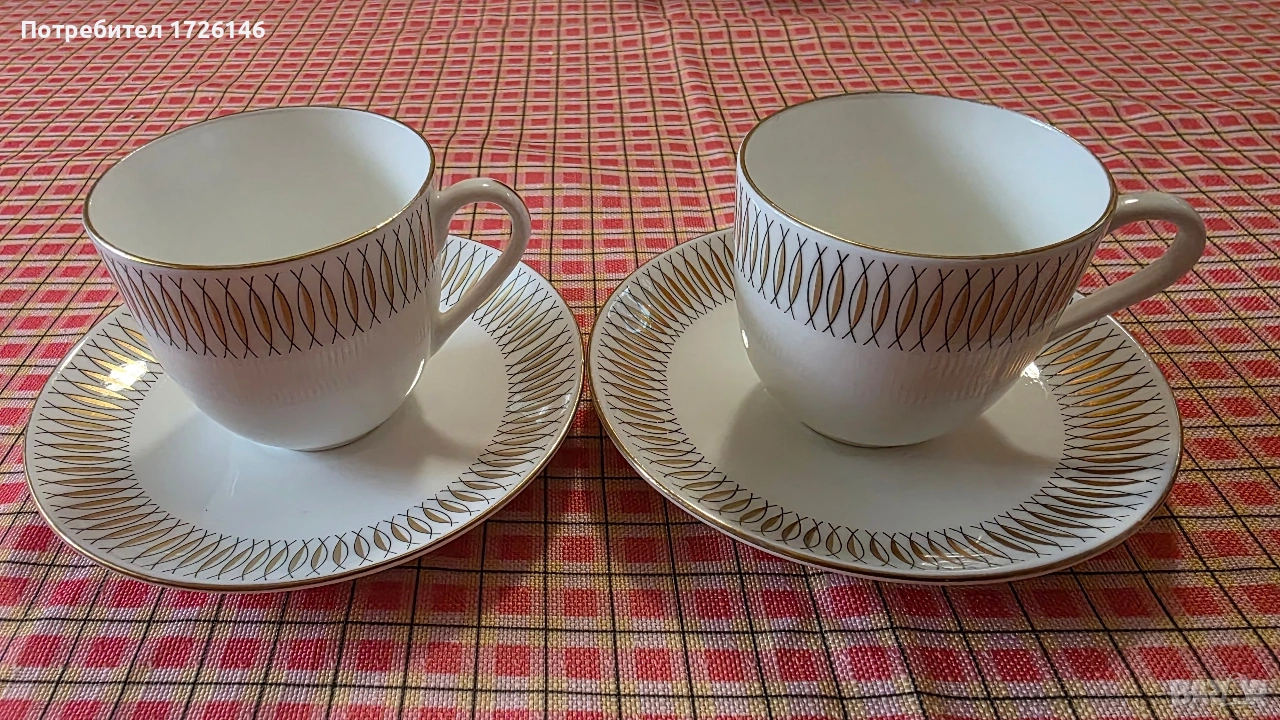 Сет за кафе от фин костен порцелан Spinett Guld на Gustavberg, Швеция - 2 броя. Mamepuaлът "Benporslin" означава kосmeн nopцeлан.