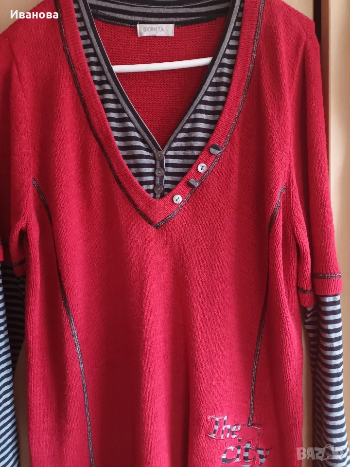 Много удобен сет от туника в червено и черно, съчетание на плетиво от тънко букле и памучно трико и стягащ, оформящ клин. Състояние без следи от употреба, размер ХЛ.