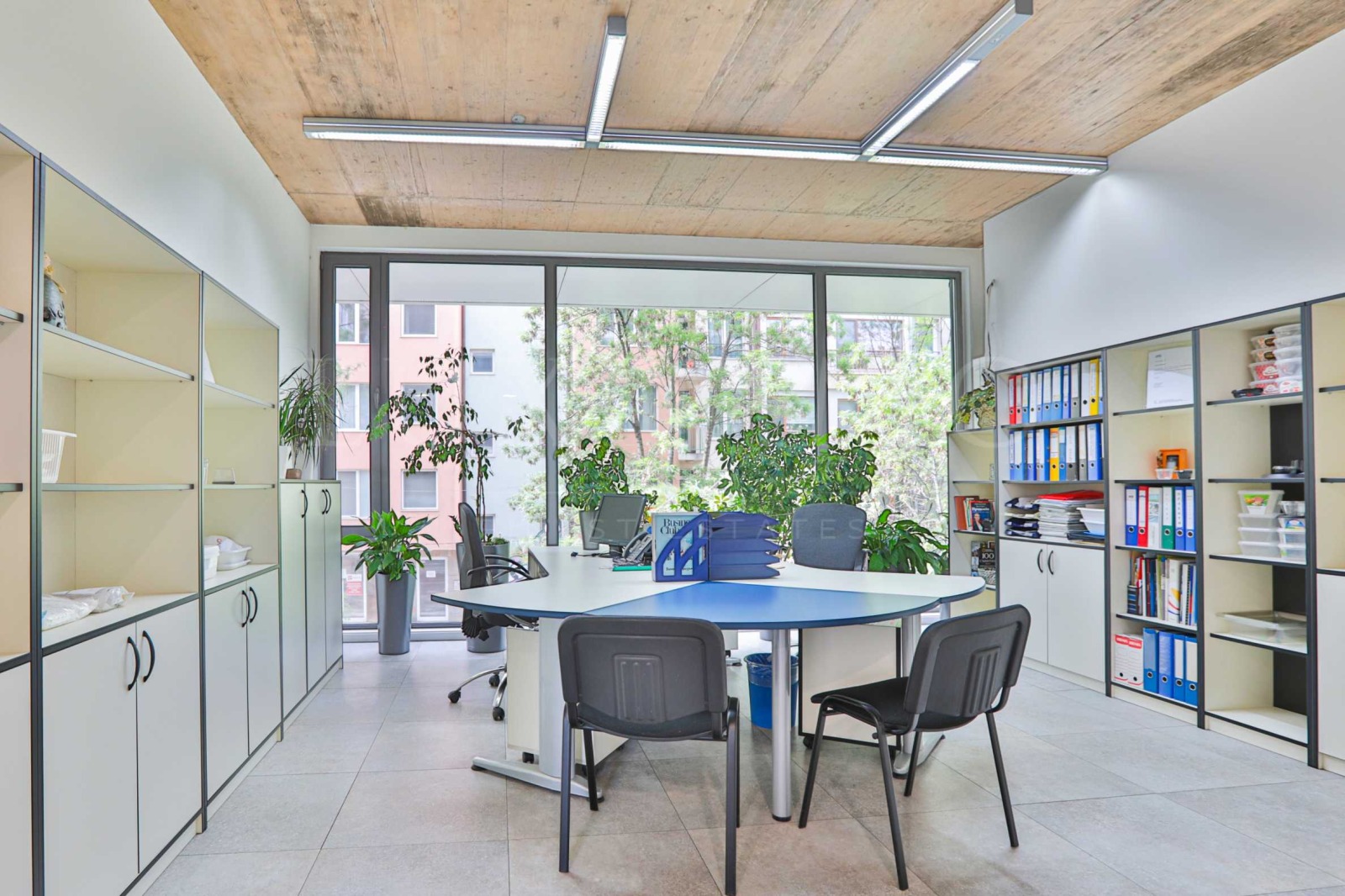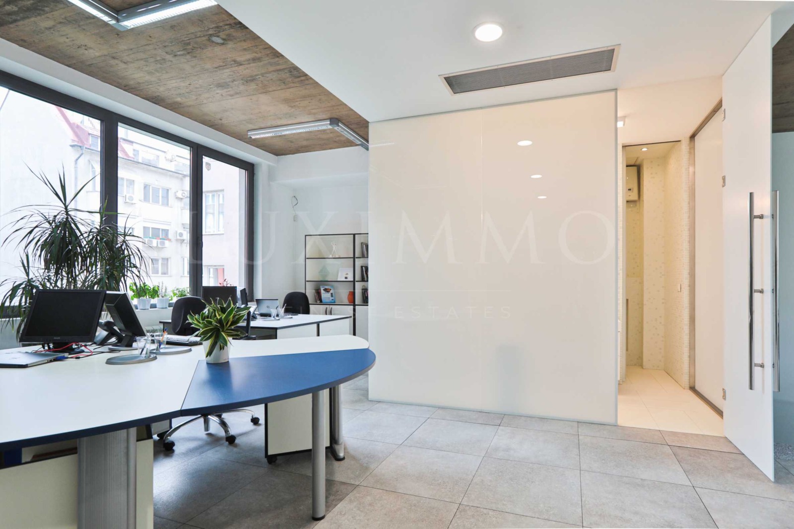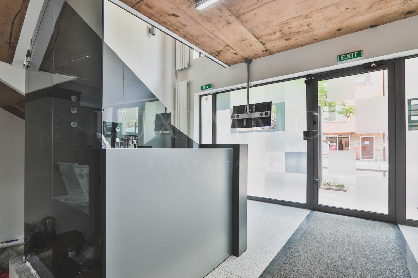 Разположен е на ет. 1 над партер, с вход от улицата и голяма витрина. Изложенията са юг и север. С големи витрини и естествена светлина. Общо работните места ще са до 8 бр., за да може наемателите да работят в тиха и спокойна среда.