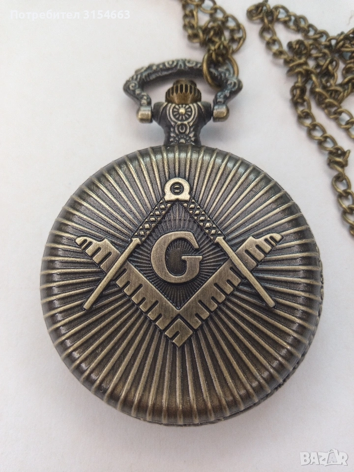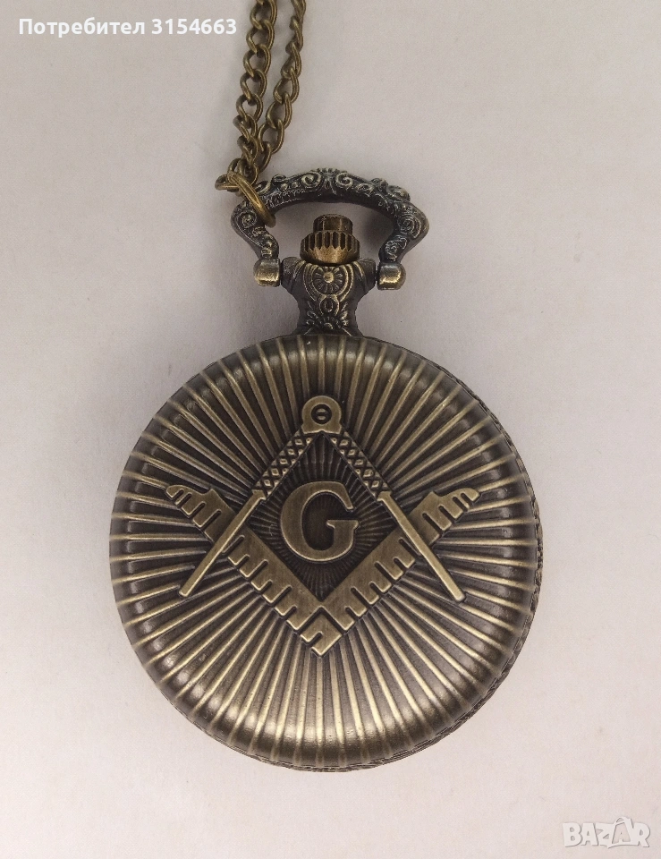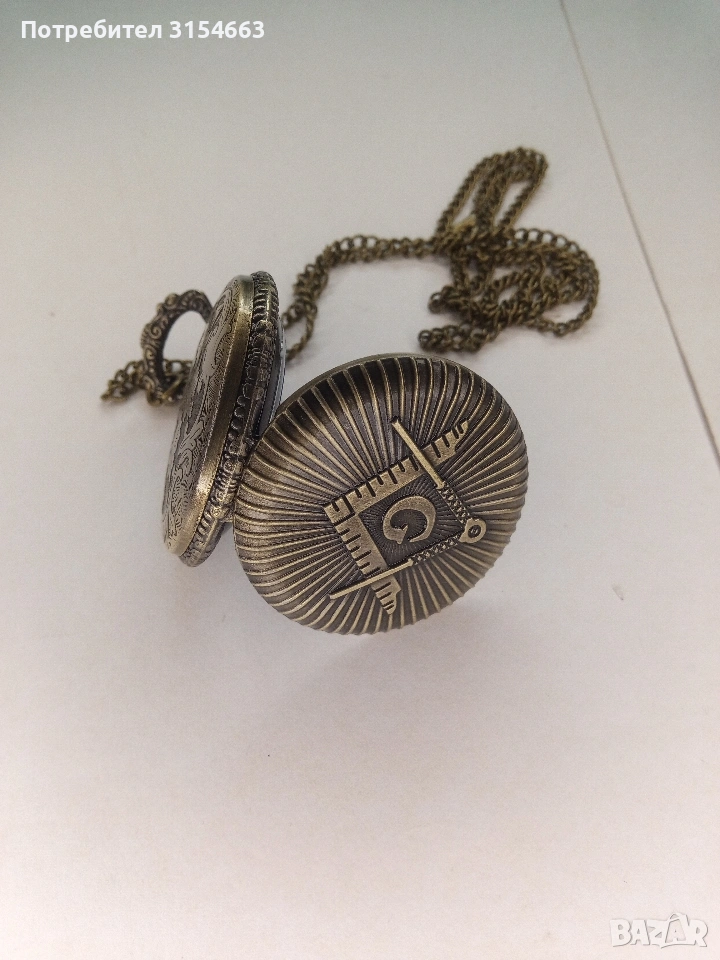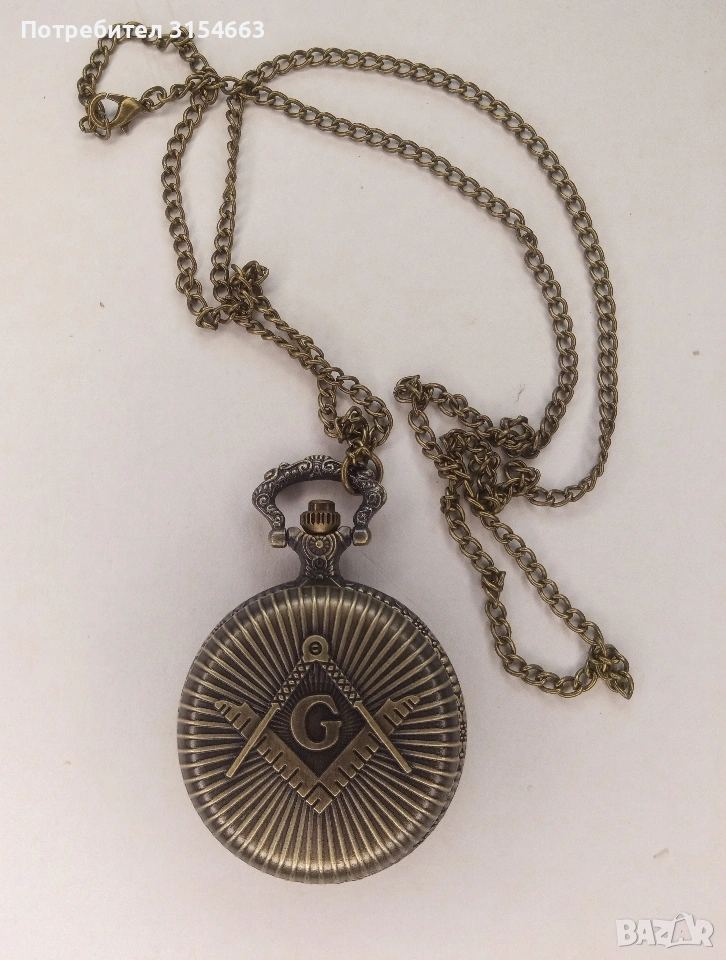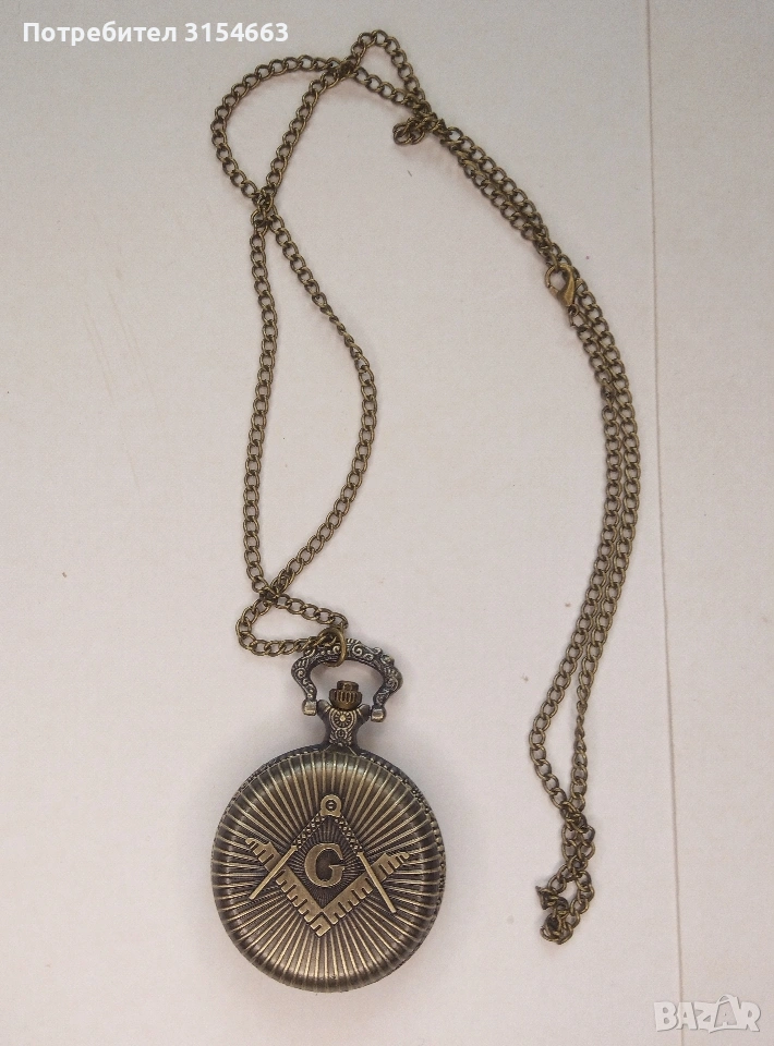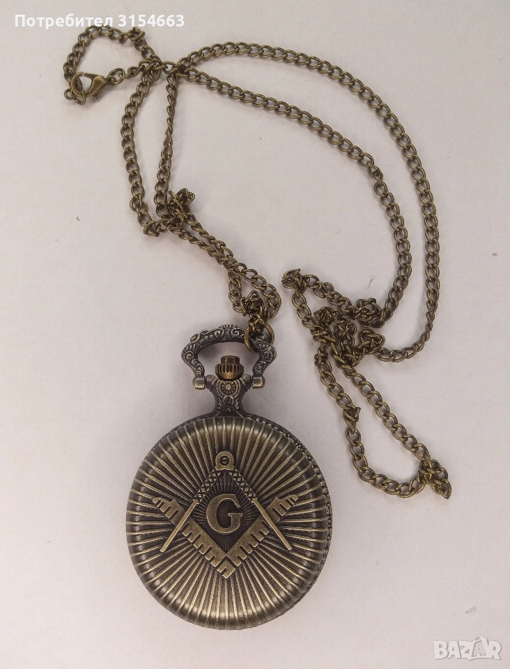 Джобен часовник с масонски символи. Диаметър 4,5 см. Верижка с закопчалка. Дължина на верижката 65 см.