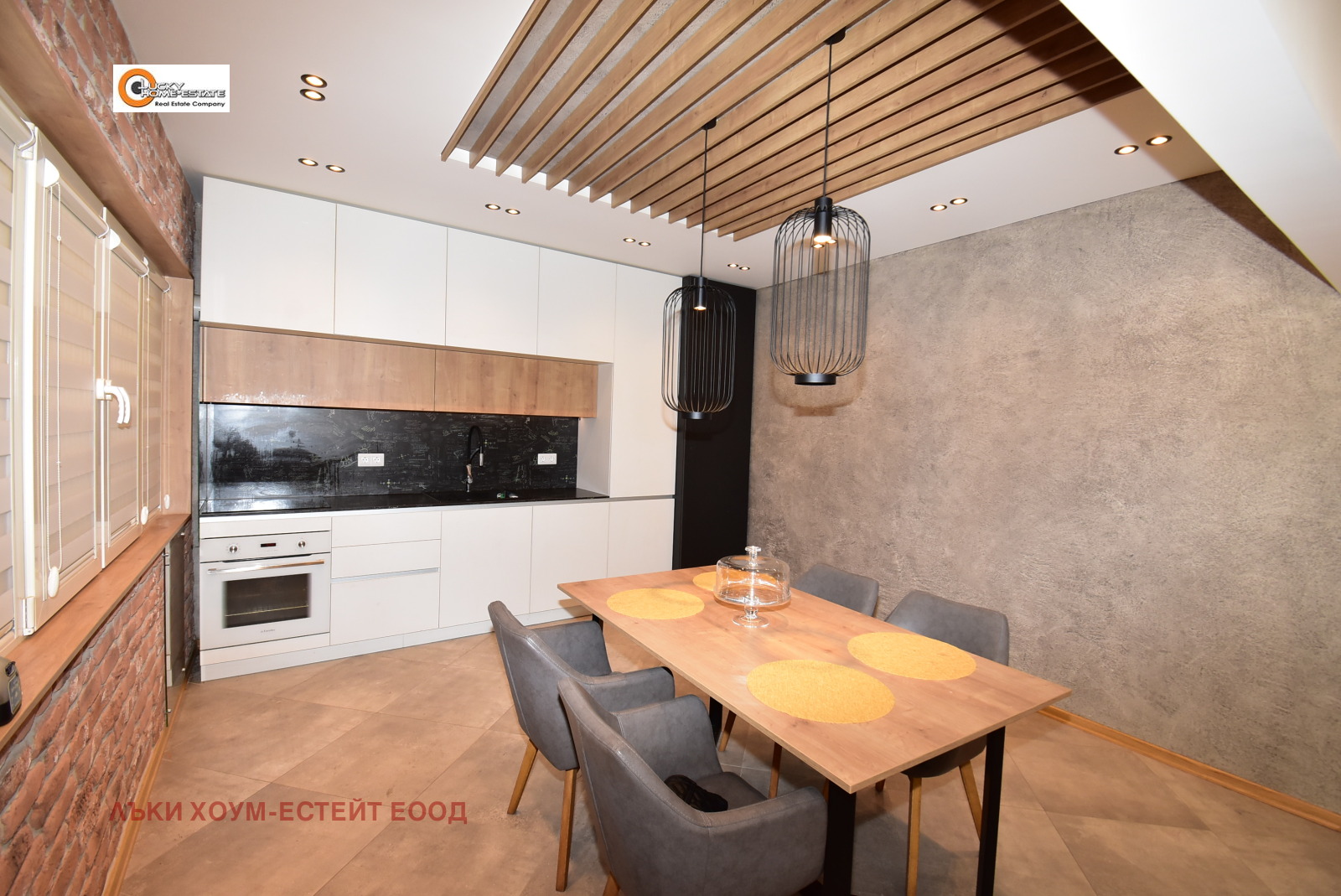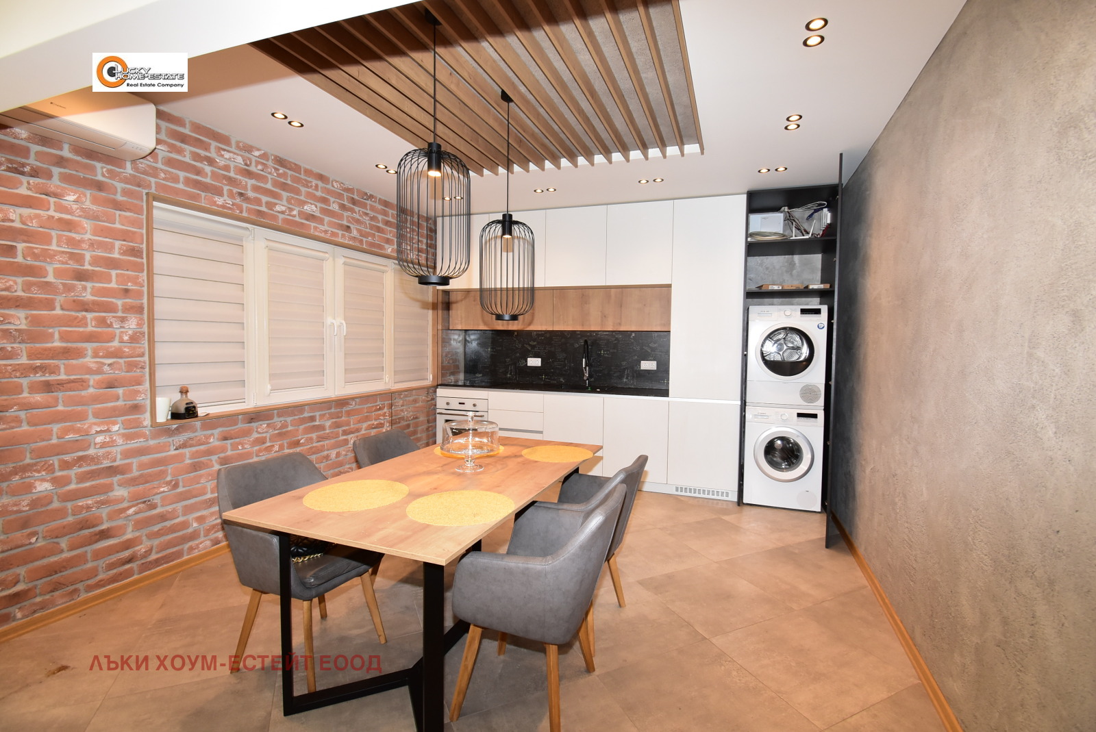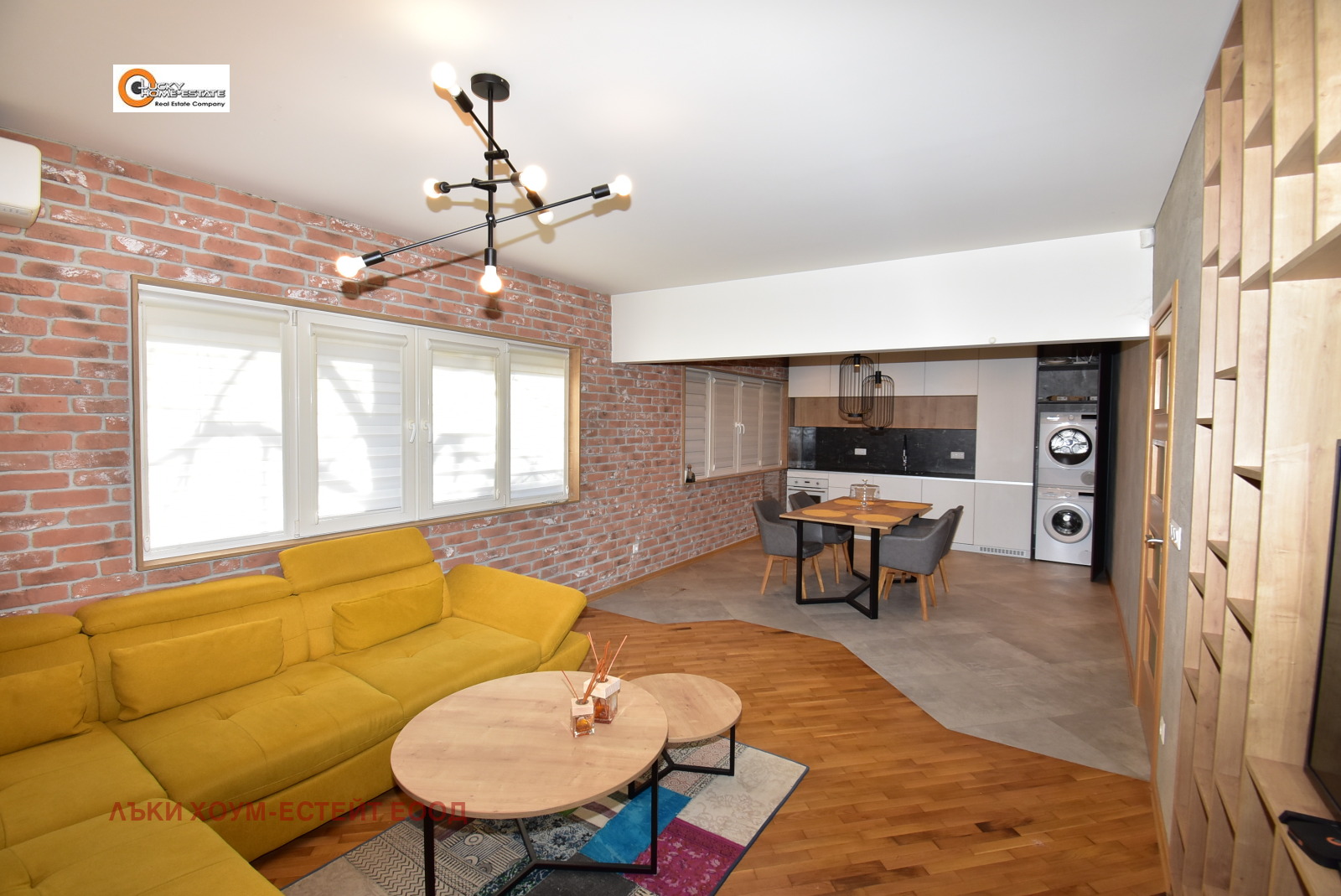 Лъки Хоум Естейт представя луксозно завършено тристайно жилище под наем. Апартаментът е разположен на тихата улица Крум Попов, на висок първи етаж, допълнително обезопасен посредством щори с дистанционно управление. Сградата е солидно тухлено строителство, с добри общи части и прилежащ паркинг във вътрешен двор.
