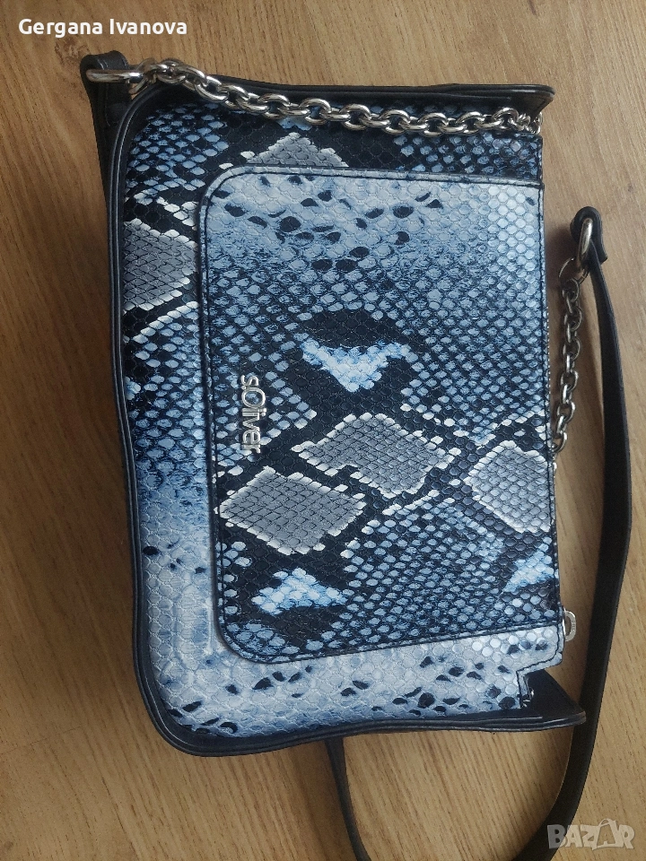 Дамска чанта S.Oliver, нова, без следи от употреба. Дълга дръжка, ефект крокодилите кожа в сиво-синьо, дръжка - черно и сребрист синджир,цип и два вътрешни джоба. Размери: 21х15х6.5см