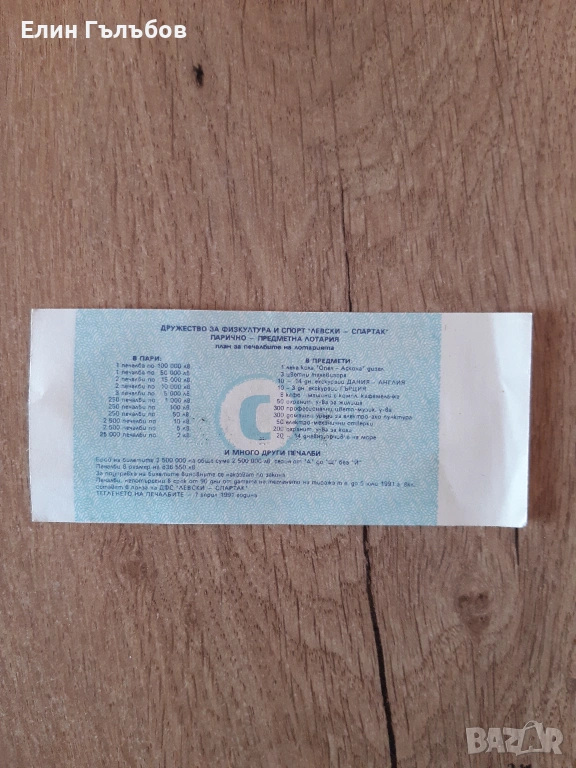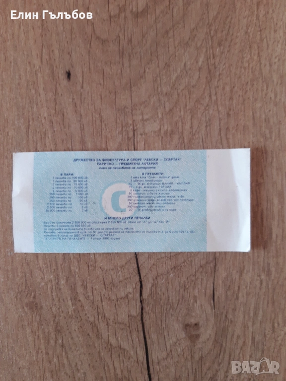 Лотарийният билет на ДФС Левски -Спартак е във вида си така както е произведен . Непрегъван .