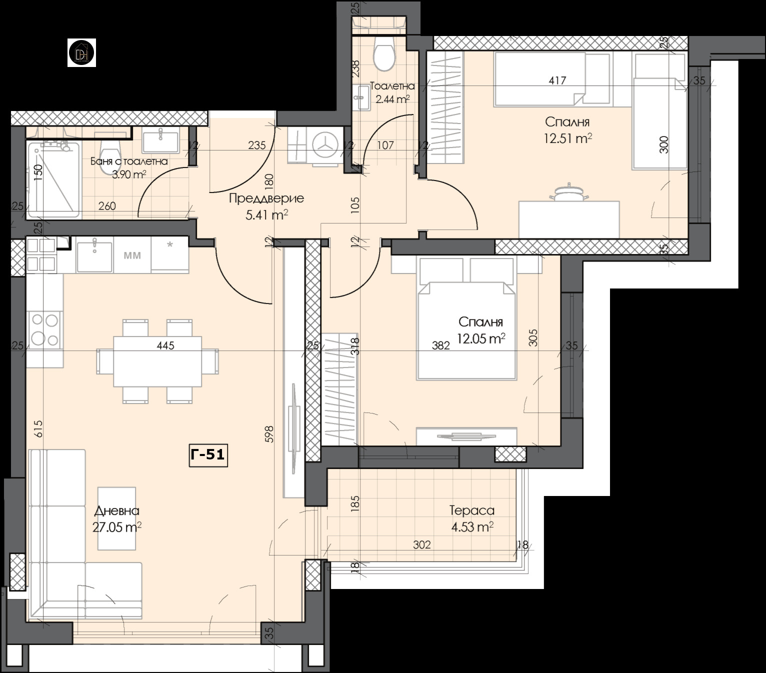 📐 Разпределението включва: Предверие, дневна с трапезария, две спални, баня с тоалетна, тоалетна, тераса