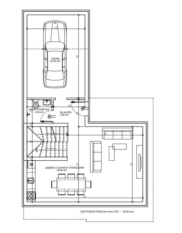 Първи етаж предверие, просторна дневна с кухненски бокс, баня с тоалетна и уютна веранда; Втори етаж коридор, три спални, две бани с тоалетни и тераса;