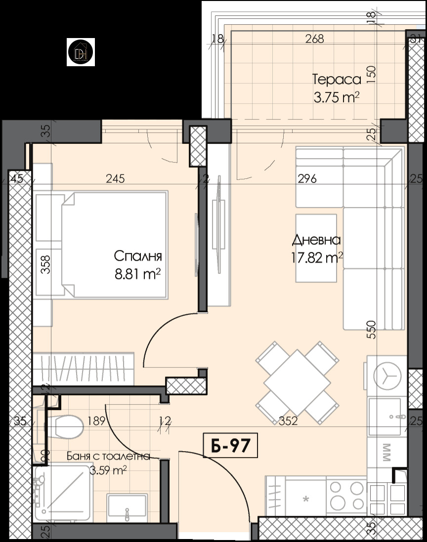 📐 Разпределението включва: Дневна с трапезария, спалня, баня с тоалетна, тераса