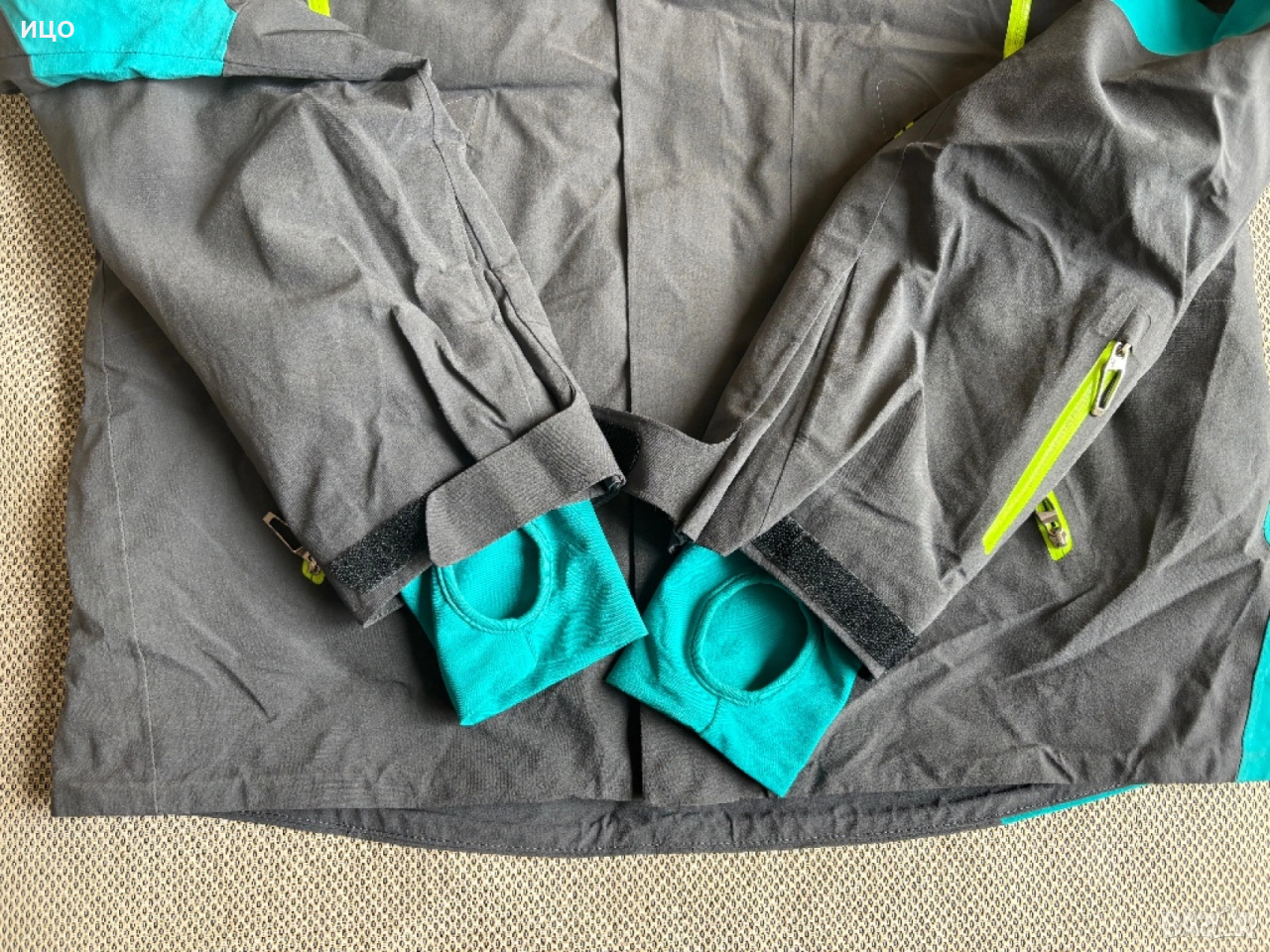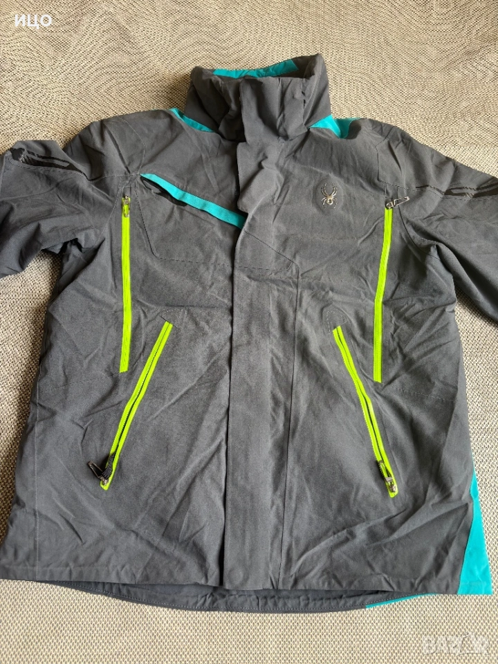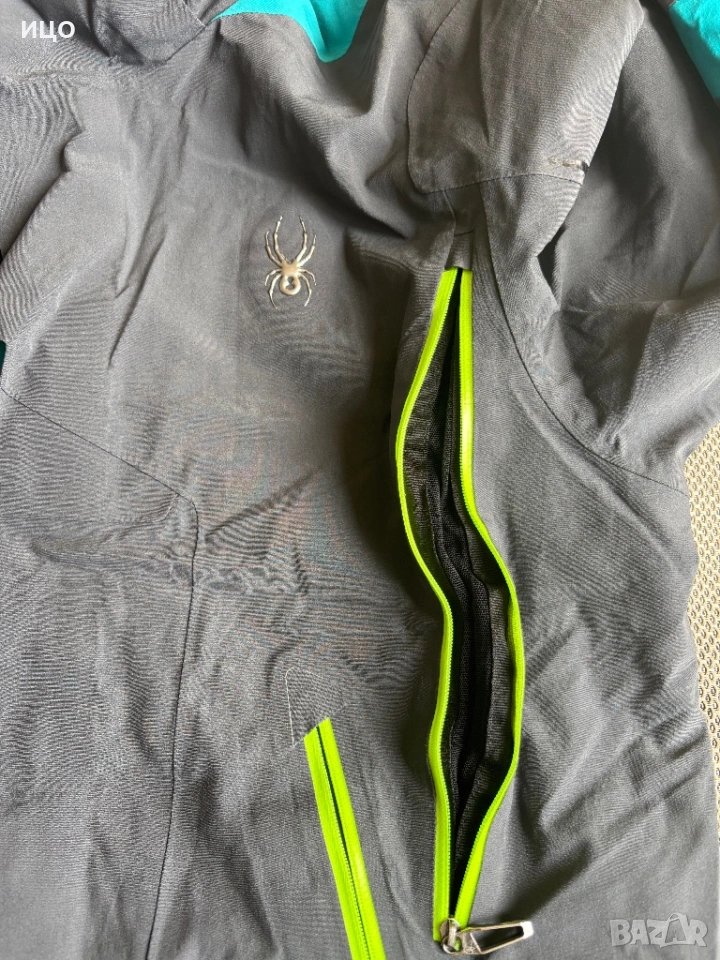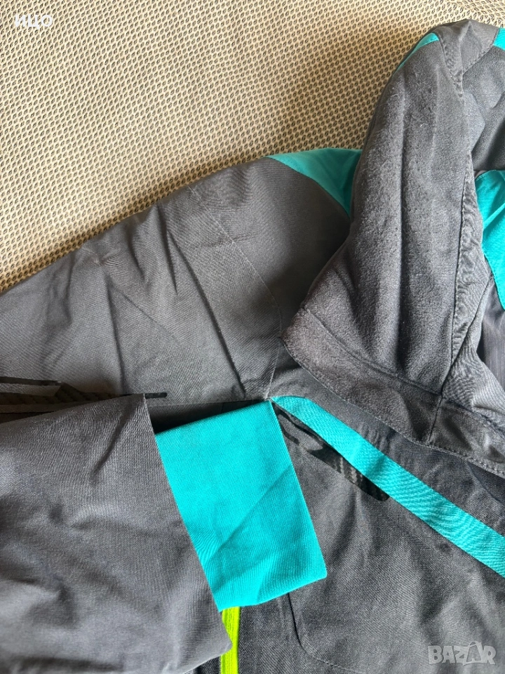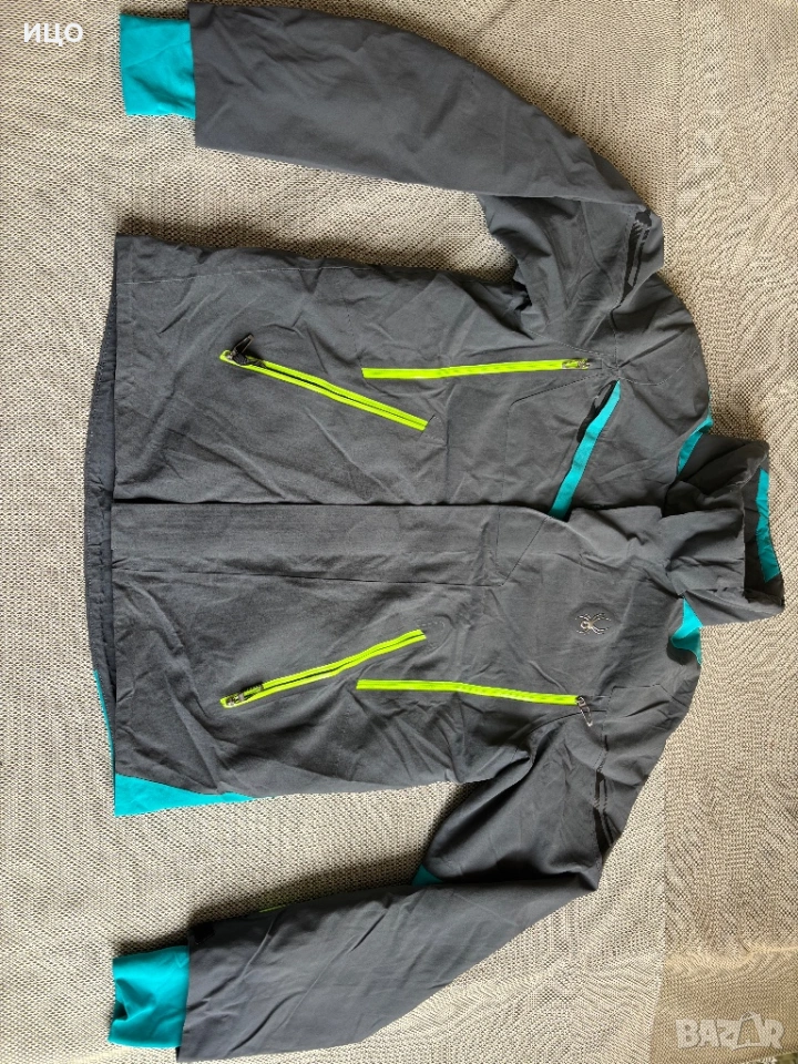 Без качулка. На последна снимка показано много минимално захабено на яка, рамо и минимално изцапано на ластик на ръка.