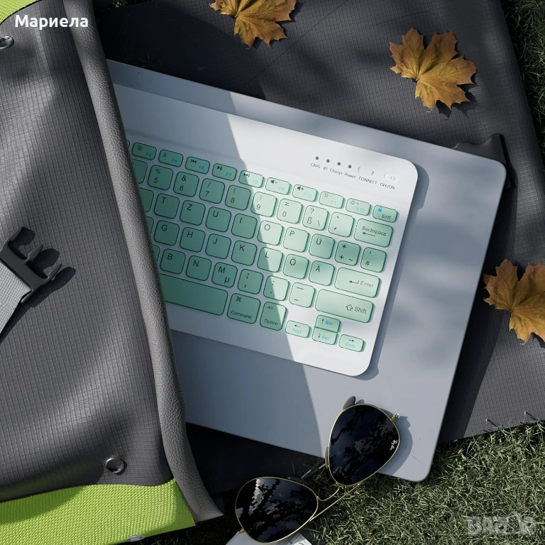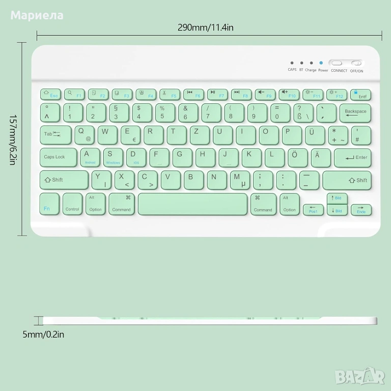 Размерът на Bluetooth клавиатурата е 29 x 15,7 x 0,5 см (11,4 x 6,2 x 0,2 инча), а благодарение на ултратънкия и ултралек дизайн, можете да я носите в раница, чанта за компютър или куфар.