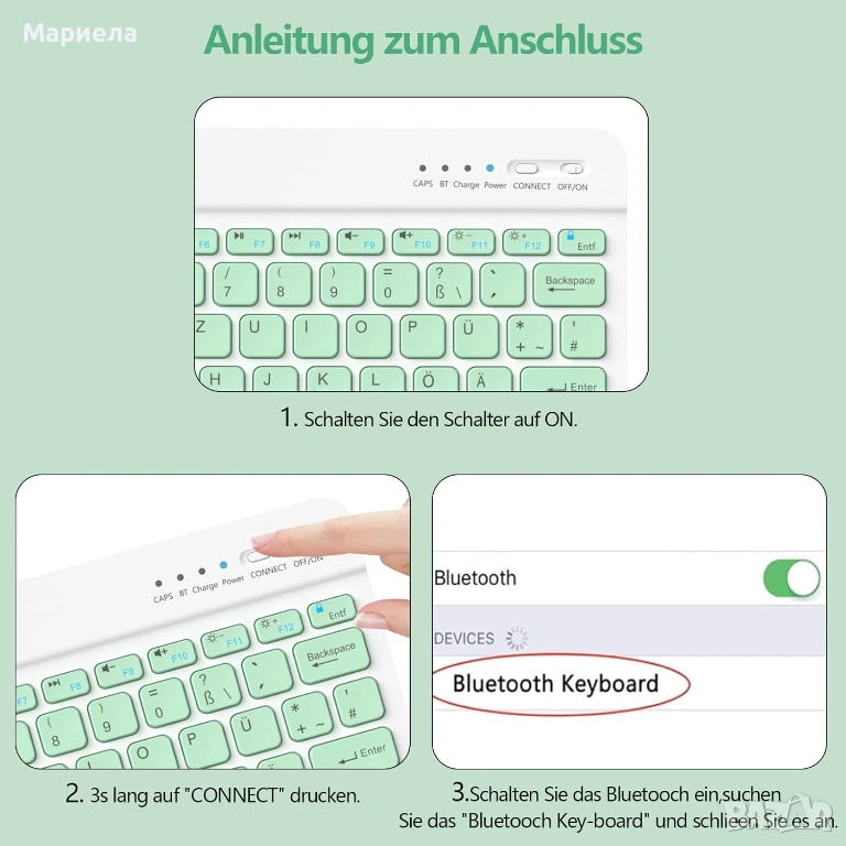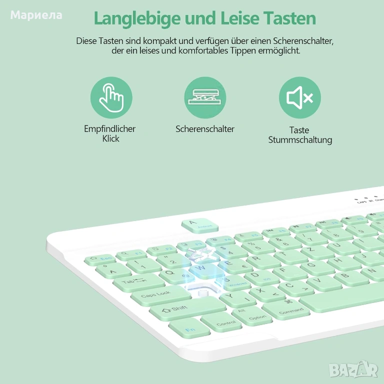 Безжичната Bluetooth връзка ви осигурява по-голямо удобство при писане, обхват до 10 метра и време на готовност от 130 дни с двучасово зареждане с включения USB кабел за зареждане.