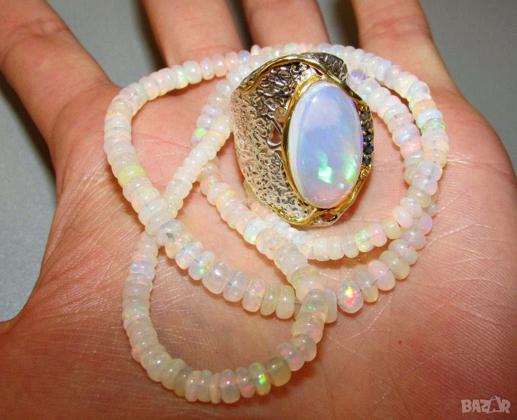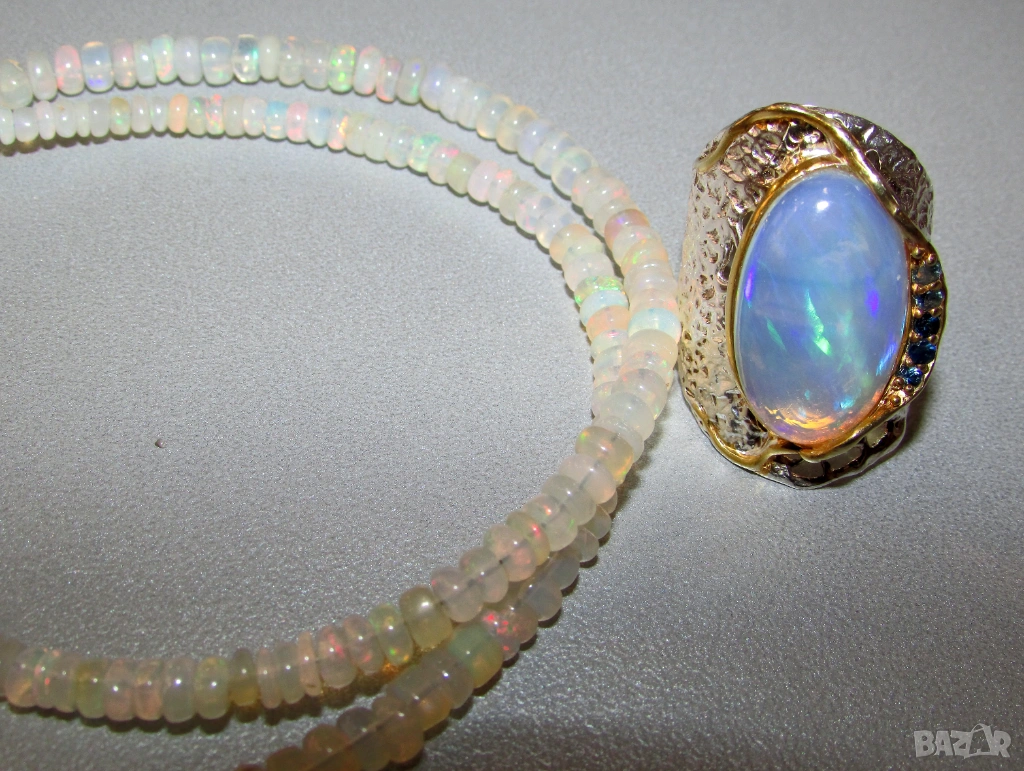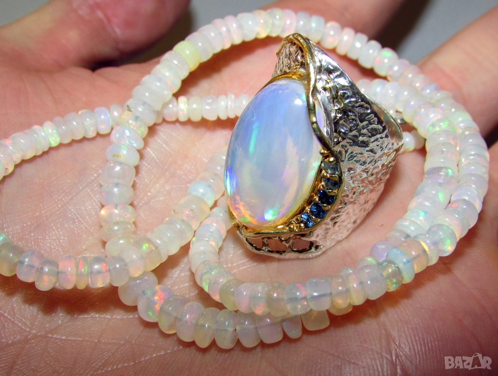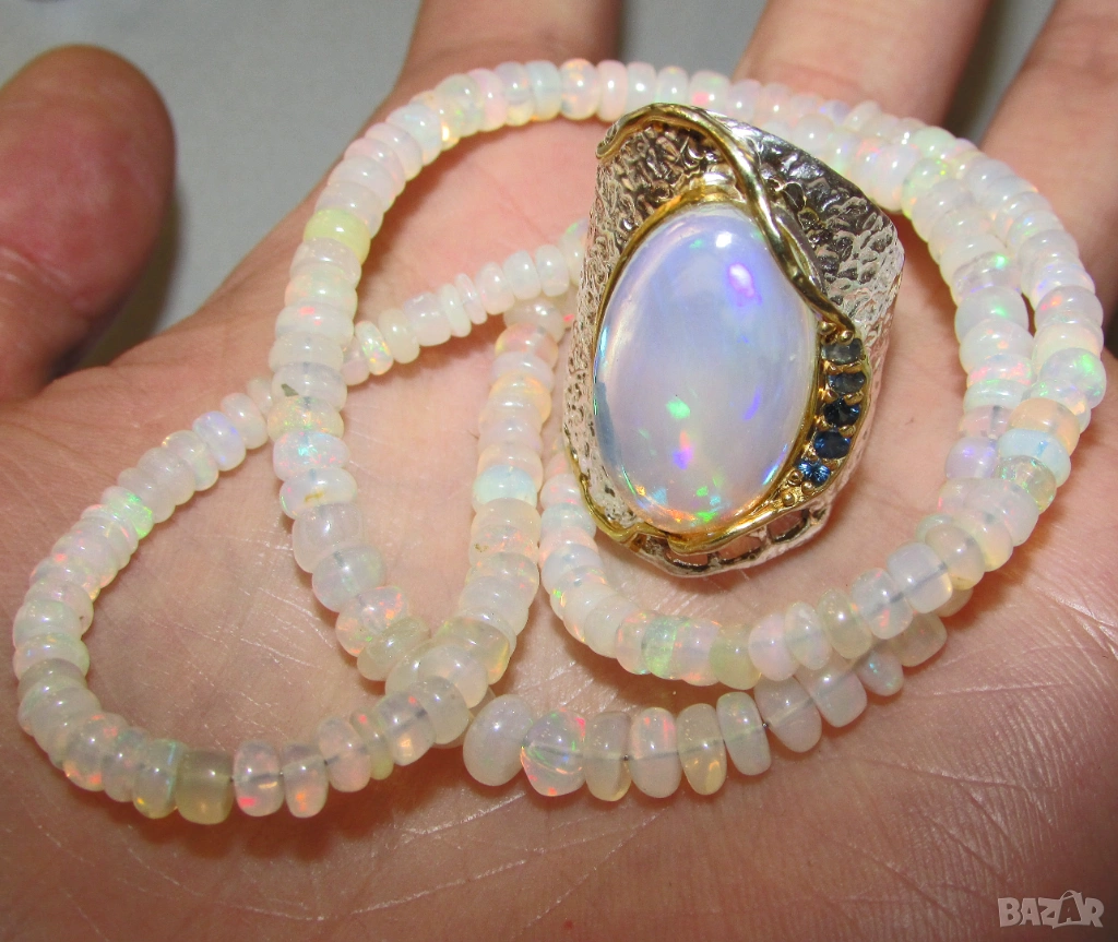 925 прекрасен сребърен пръстен с опал, много бял прозрачен и с различни цветни отблясъщи в много нюанси. Най-ефектен на слънце. Камък 21х13мм. Тегло на камъка 13карата, тегло на пръстена 12гр. Златно покритие - бяло и жълто. Другите камъни са сапфири и топаз. Произход Етиопия. Гердана е към пръстена. Цена 410 евро.