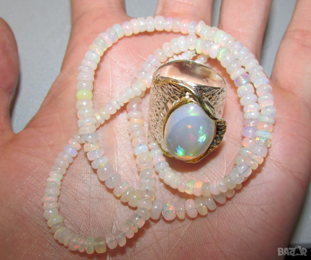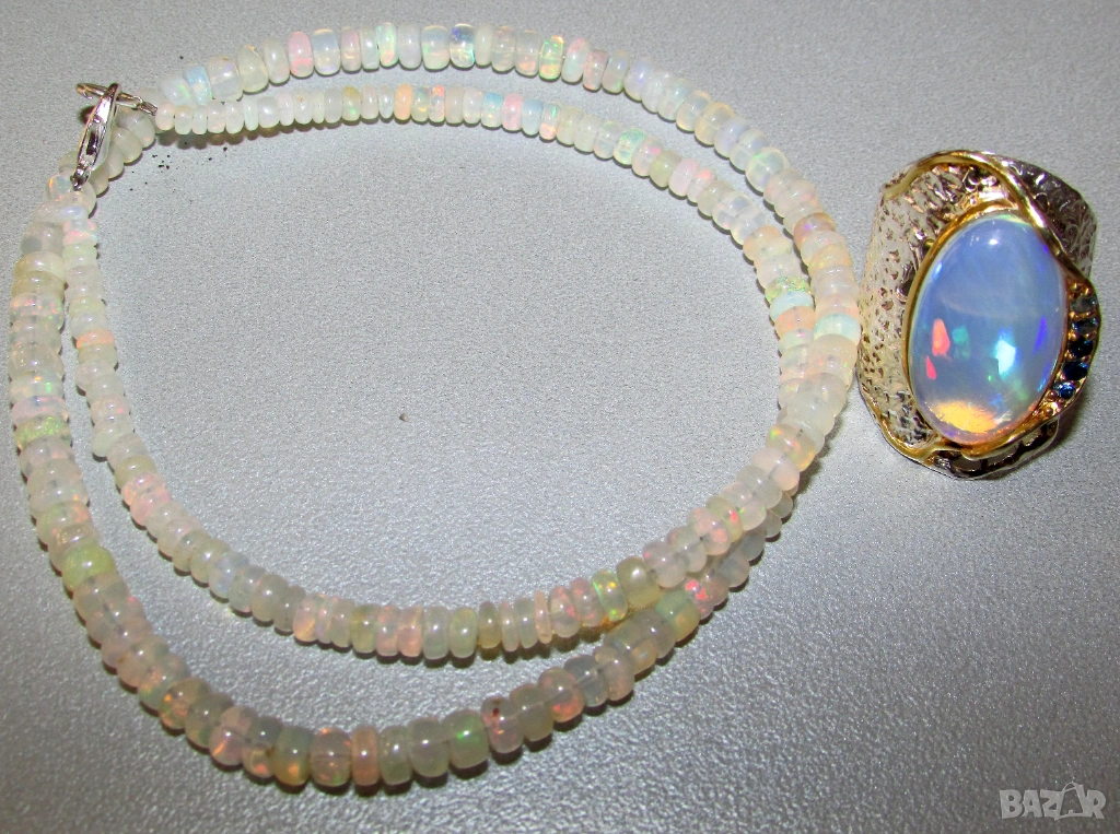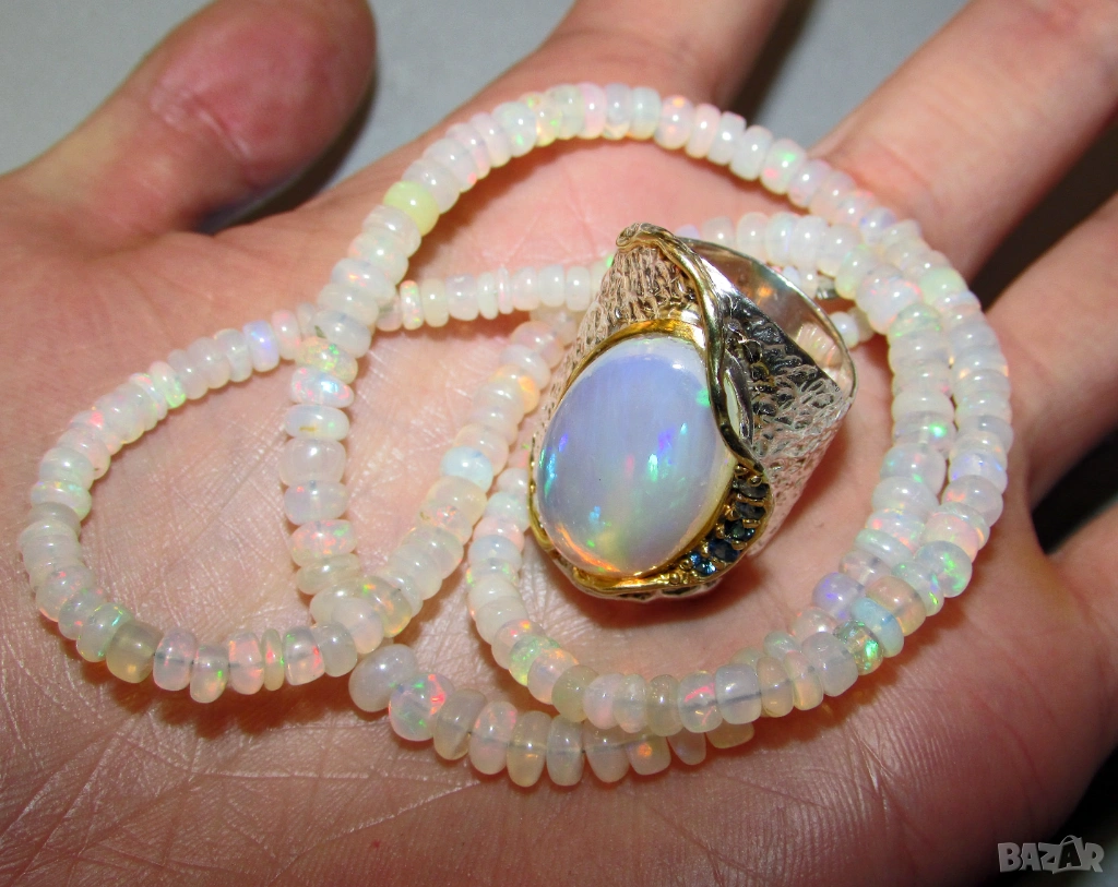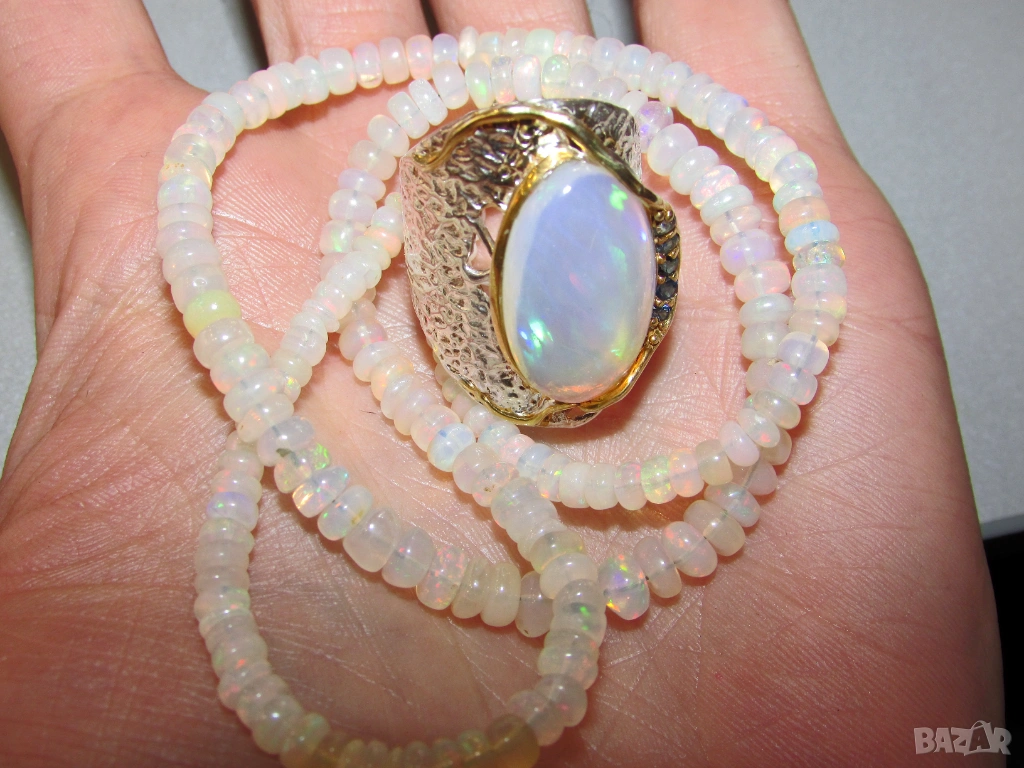 925 прекрасен сребърен пръстен с опал, много бял прозрачен и с различни цветни отблясъщи в много нюанси. Най-ефектен на слънце. Камък 21х13мм. Тегло на камъка 13карата, тегло на пръстена 12гр. Златно покритие - бяло и жълто. Другите камъни са сапфири и топаз. Произход Етиопия. Гердана е към пръстена. Цена 410 евро.
