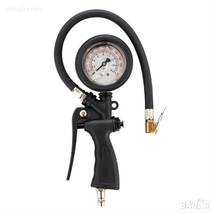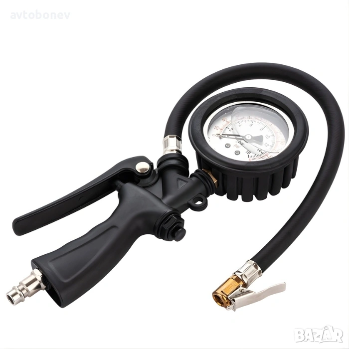 Практичен и надежден пистолет за помпене на гуми, оборудван с вграден манометър с глицерин за максимална точност при измерване на налягането. Подходящ както за автомобили, така и за мотори, велосипеди и други превозни средства.