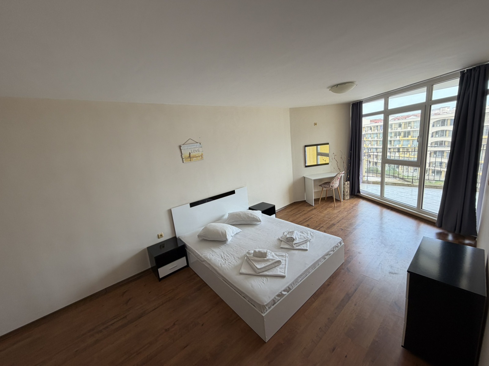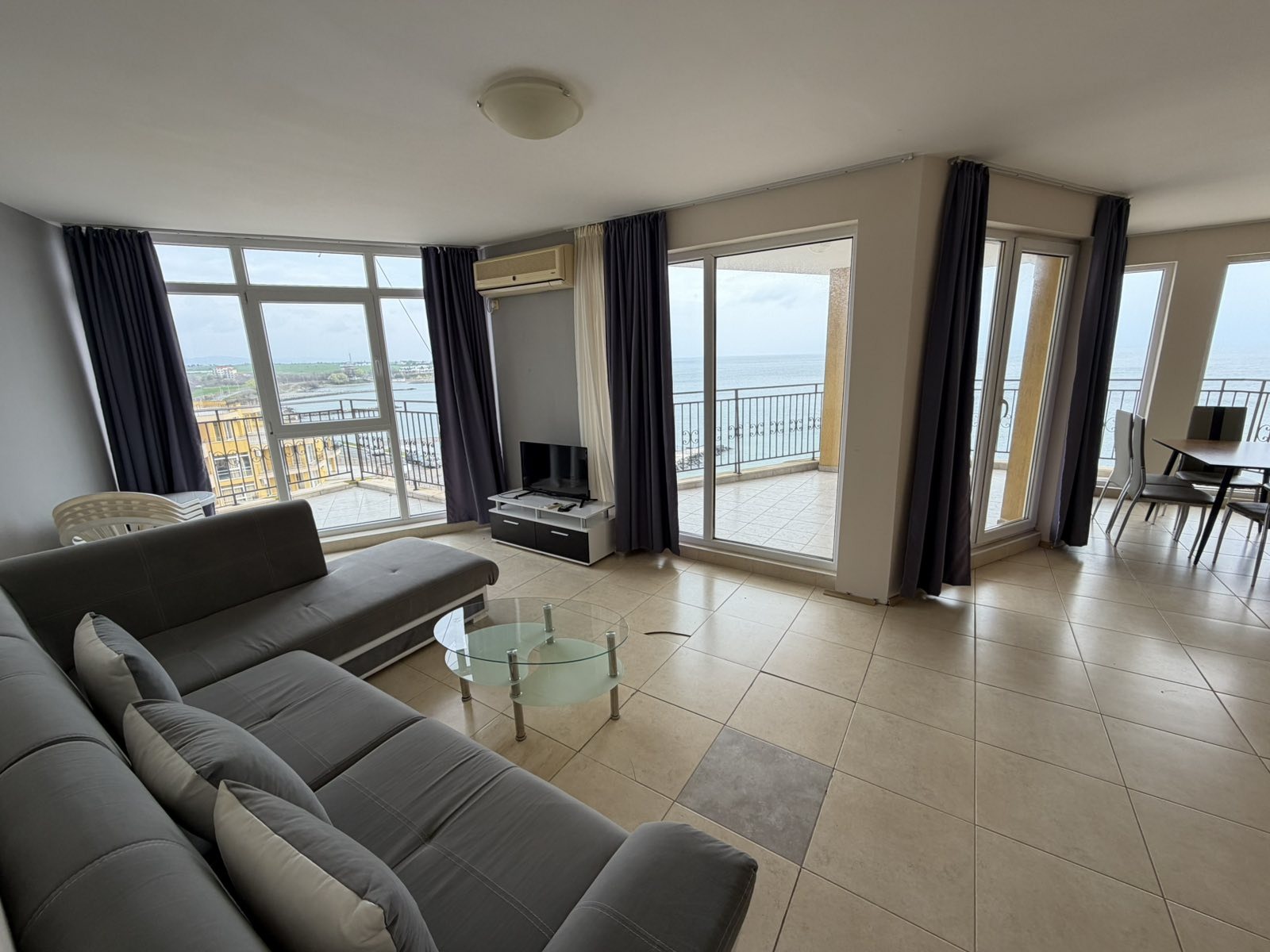 Продава се изключително голям и просторен тристаен апартамент в Ахелой, разположен на пети етаж в затворен, целогодишен и охраняем комплекс с развита инфраструктура, включваща магазини, ресторанти, басейни и собствен аквапарк, предлагащ висок стандарт на живот и комфорт за почивка и постоянно обитаване. Апартаментът се отличава с впечатляваща площ, функционално разпределение и много естествена светлина, създаващи усещане за простор и уют. Жилището се продава напълно обзаведено с мебели и оборудвано с модерна домакинска техника и е готово за незабавно нанасяне или отдаване под наем без допълнителни инвестиции. Основно предимство на имота е уникалната фронтална панорамна гледка към морето, която се открива от всеки прозорец и от просторната тераса, позволявайки да се наслаждавате на морската панорама по всяко време на деня. Комплексът предлага отлично поддържана територия, сигурна среда и всички необходими удобства за комфортен начин на живот, което прави имота отличен избор както за целогодишно живеене, така и за почивка или инвестиция с висок потенциал за доходност. Имотът разполага с Акт 16, което гарантира неговата законност и готовност за ползване.