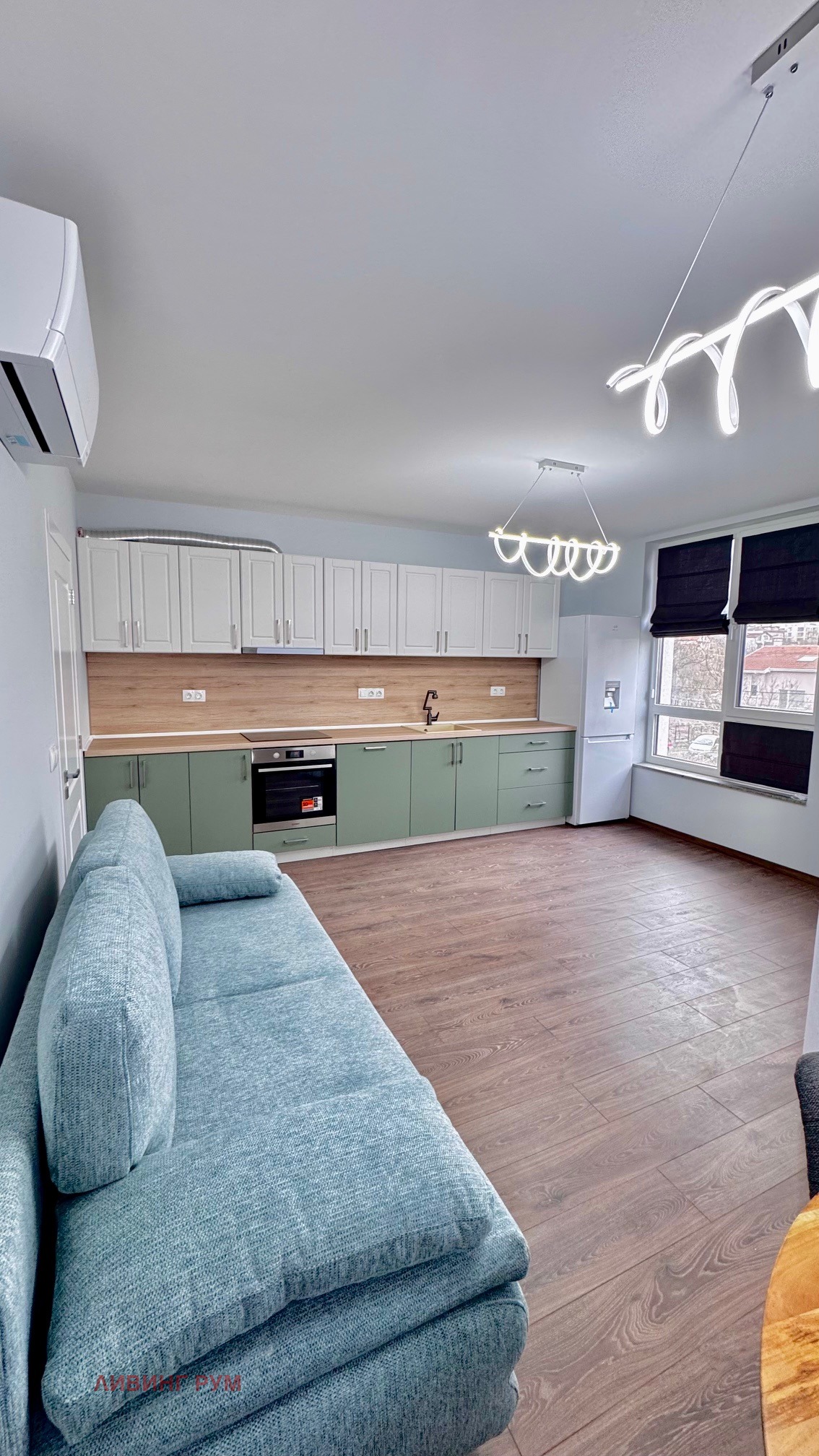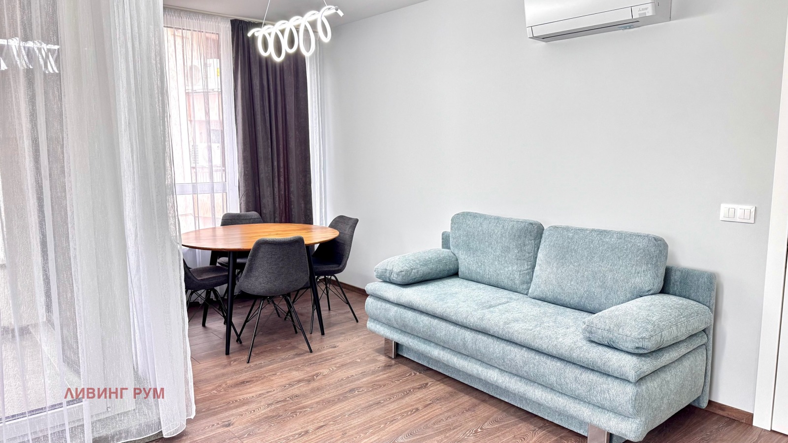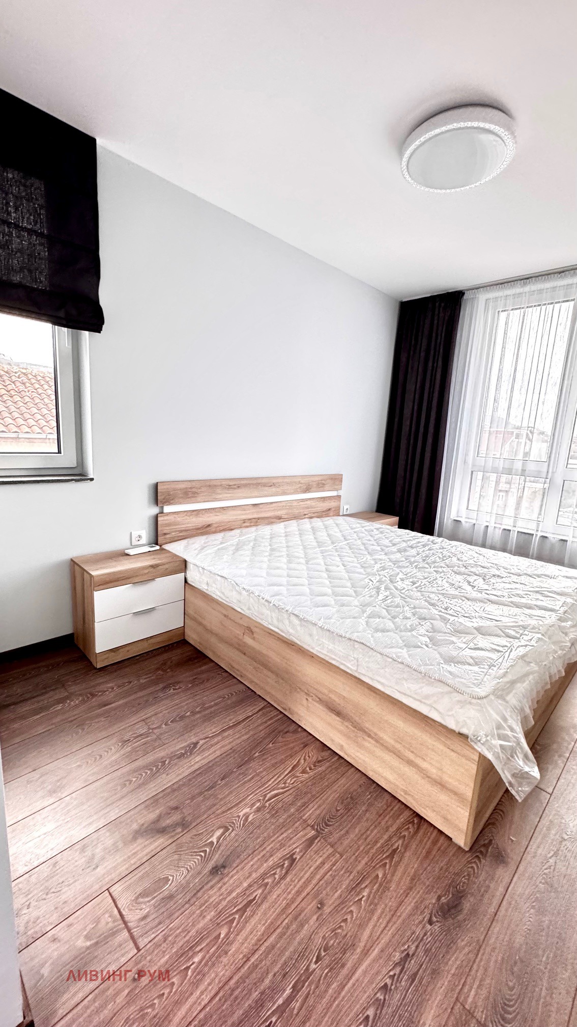 Апартаментът е със следното разпределение: коридор с портманто и гардероб, килер с пералня, сушилня и бойлер, дневна с кухненска част и трапезария (оборудвани с аспиратор, фурна, котлони, съдомиялна, хладилник с фризер; маса за хранене с 4 стола, диван, телевизор, тънки и плътни завеси, климатик), родителска спалня (двойно легло с две нощни шкафчета, трикрилен гардероб, климатик), детска спалня (ще бъде обзаведена според желанието на наемателите), баня с тоалет с отделена душ зона с параван, балкон от дневната стая.