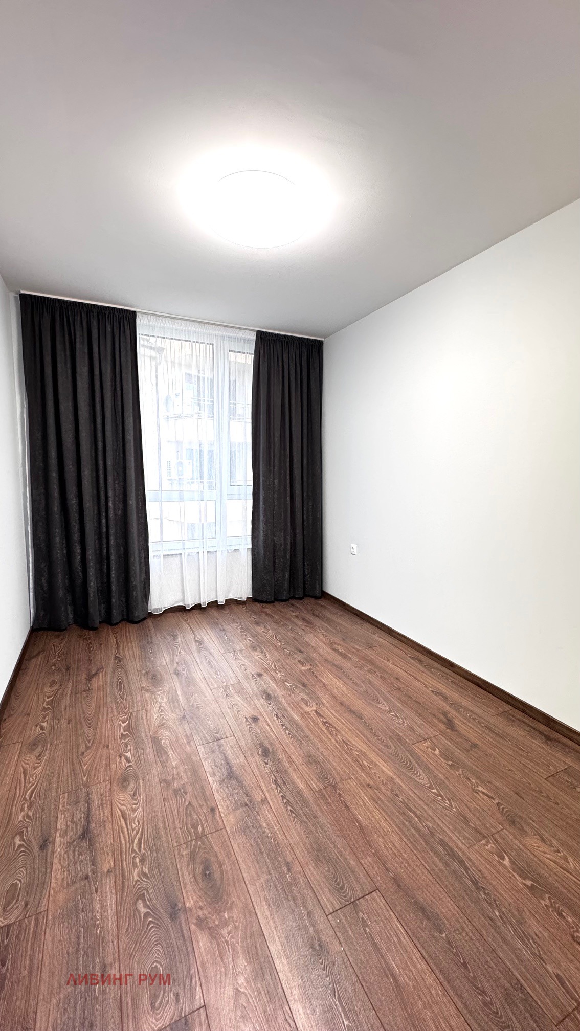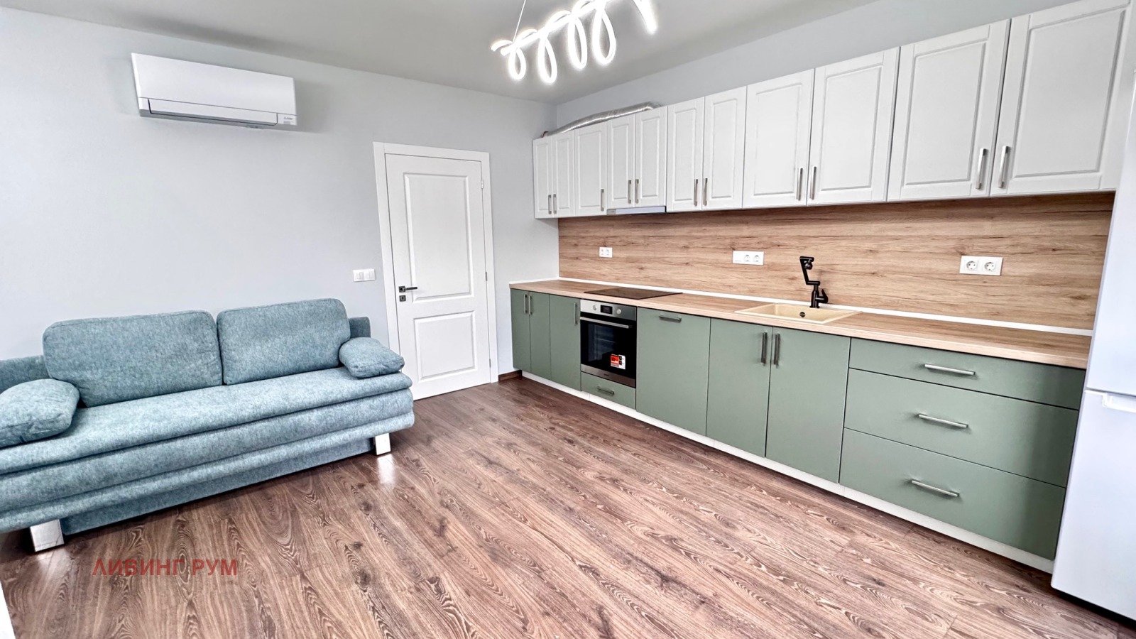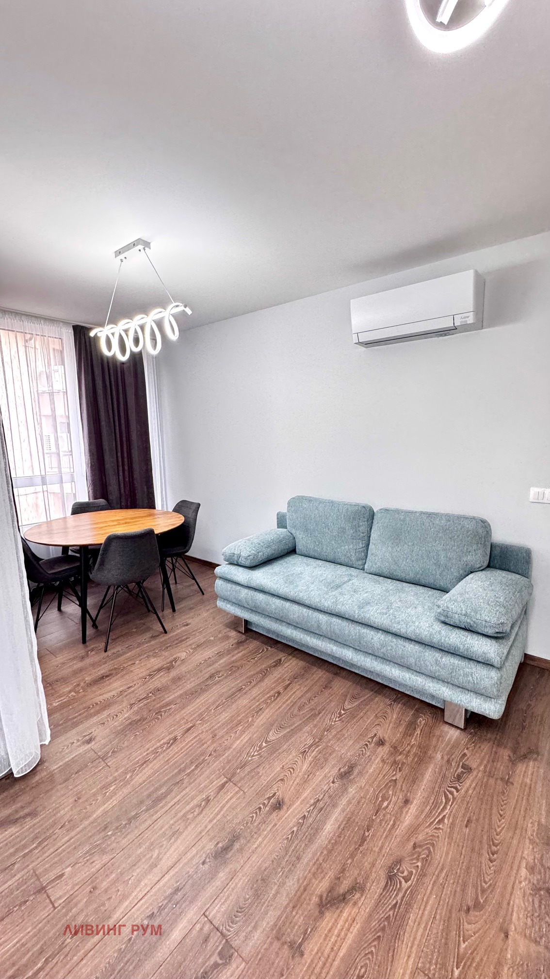 Апартаментът е със следното разпределение: коридор с портманто и гардероб, килер с пералня, сушилня и бойлер, дневна с кухненска част и трапезария (оборудвани с аспиратор, фурна, котлони, съдомиялна, хладилник с фризер; маса за хранене с 4 стола, диван, телевизор, тънки и плътни завеси, климатик), родителска спалня (двойно легло с две нощни шкафчета, трикрилен гардероб, климатик), детска спалня (ще бъде обзаведена според желанието на наемателите), баня с тоалет с отделена душ зона с параван, балкон от дневната стая.