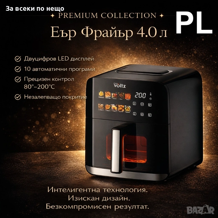 Фритюрник Air Fryer Oliver Volzt OV51980CE, 1200W, кошница 4 л., LED дисплей, 10 предварително зададени програми, Таймер