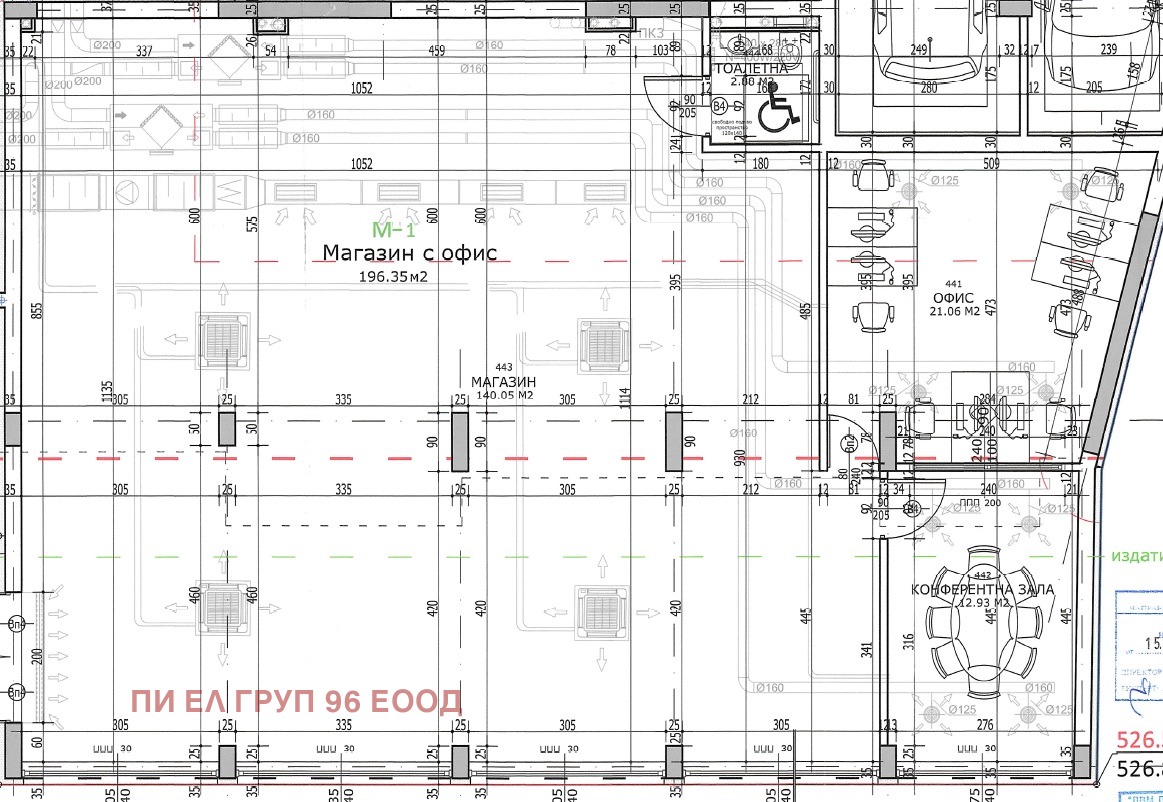 Подходящо за шоурум, магазин и тн. дейности. Височина на таваните - 3 метра, 20 метра лице. Състои се от търговска зала 140 м2, офис-21 м2, конферентна зала - 13 м2. Възможни са преустройства.