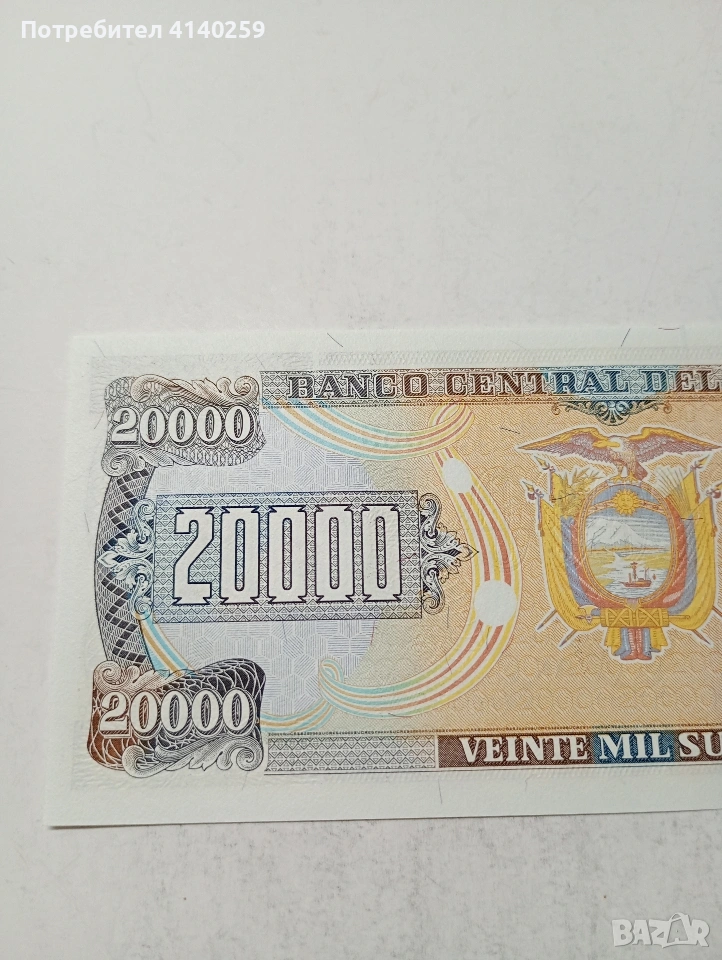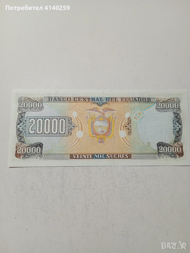 ЕКВАДОР БАНКНОТА 20,000 СУКРЕ 1999 Г СЪСТОЯНИЕ НОВО ПОЛУЧАВАТЕ СНИМАНАТА БАНКНОТА РАЗГЛЕДАЙТЕ ДРУГИТЕ МИ ОБЯВИ ДА КОМБИНИРАТЕ ДОСТАВКА ЕКОНТ ЗА ВАРНА ЛИЧНО
