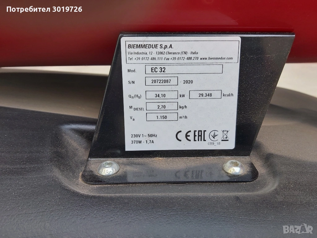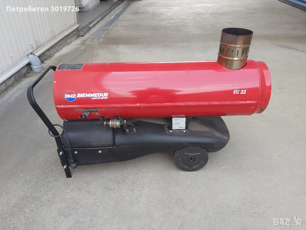 Дизелов отоплител с индиректно горене BIEMMEDUE EC 32. Отоплителна мощност 34 kW, дебит на въздуха 1150 м3/ч, обем на резервоара 42 литра. Горивна камера от неръждаема стомана, устойчива на температура, авариен прекъсвач при прегряване, подхадящ за отопление на средни и големи помещения и за изсушаване в сторителството. Отоплителя е почти нов. Използван е за отопление само една зима.
