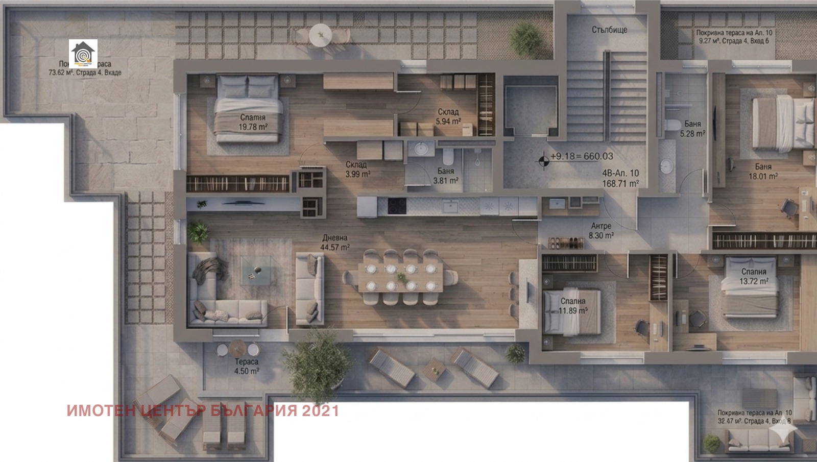 - Имотът разполага с функционално разпределение на помещенията и излаз към тераса от всяко едно! Дневната е 45 кв.м чиста площ с изложение юг и запад и изход към разширената част на покривната тераса директно насочена към Витоша. Родителската спалня от 20 кв.м е насочена на запад и разполага също със собствен санитарен възел, гардеробна и мокро помещение. Останалите три спални са непреходни, като две са насочени на юг/югозапад, а третата на север/североизток, която разполага със собствена тераса. Към тях има просторна баня с тоалетна.