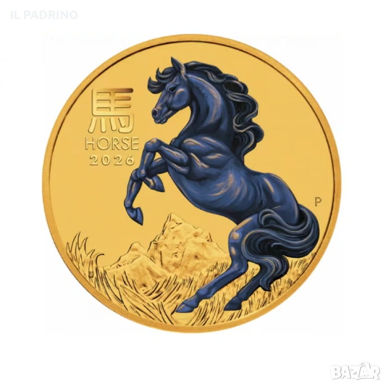 На обратната страна на златната монета „2026 Година на коня“ от Монетния двор Перт Лунар от 1/10 унция изобразява драматично изображение на изправен кон, проектиран от Инг Инг Джонг, разположен на фона на планини и тревисти равнини. Включва надписа „HORSE 2026“ – китайският йероглиф за „кон“ – заедно с знака на монетния двор на Монетния двор Перт „P“.