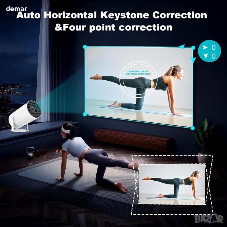 Интелигентен проектор с Android TV 13.0, предлагащ достъп до над 4000 приложения и 500 000+ филма и предавания, включително популярни стрийминг платформи, комбиниран с бърза и стабилна свързаност чрез WiFi 6 и Bluetooth 5.0. Предоставя ясни и живи визуализации с поддръжка на 1080P (съвместима с 4K съдържание), подобрена от усъвършенствана LED технология, яркост от 180 ANSI лумена и контрастно съотношение 2000:1. Разполага с автоматична корекция на трапецовидно изкривяване и ръчно фокусиране за бързо настройване на изображението, заедно с вграден 360° съраунд звук за завладяващо аудио. Неговият 180° гъвкав проекционен дизайн позволява гъвкаво гледане на стени, тавани или подове, подходящ за домашно забавление, работа или фитнес. Работи тихо под 25dB и включва множество опции за свързване, като HDMI, USB и аудио портове, поддържа външни устройства, съхранение и усъвършенствани озвучителни системи.