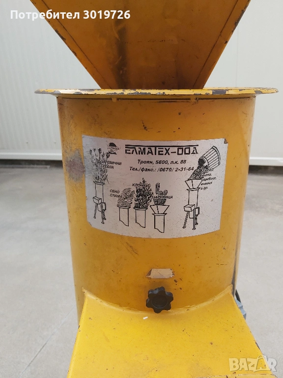 Машината е работеща, произведена е в ЕЛМАТЕХ ООД ТРОЯН. Подходяща е за приготвяне на фуражи, а също така и за смилане на дунапрен за направата на възглавници, за което е използвана до момента.