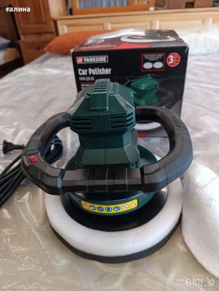 Електрическа полир машина Parkside PPM 120 A1. Уредът е идеален за лесно и качествено полиране на автомобили, мотори или лодки. Подходящ е както за нанасяне на вакса, така и за финално полиране до блясък.