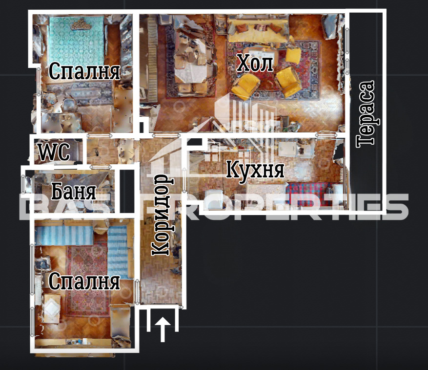 Жилището се предлага полуобзаведено, като остават кухненските шкафове и част от мебелите. Подовите настилки са теракот в кухнята и естествен дървен паркет в хола и спалните. Дограмата е PVC, а входната врата е масивна метална.