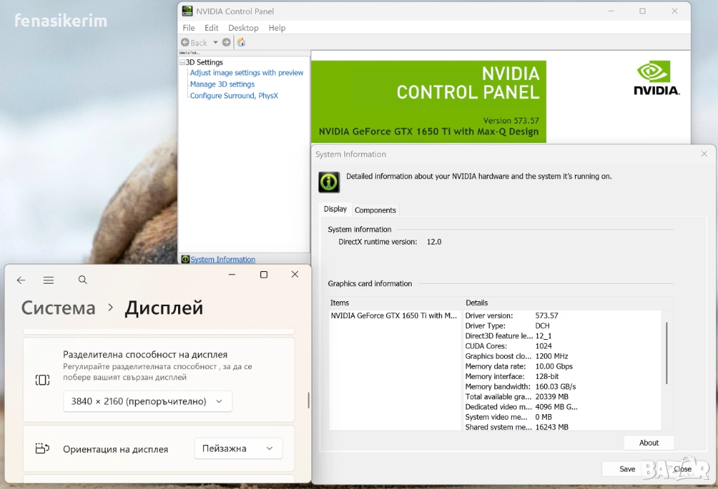 2 видеокарти : Nvidia GTX 1650 Ti Max-Q 4GB DDR6 собствена памет + Intel UHD 630 Video - 16 GB Total Graphics memory.