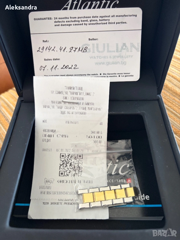 Продавам часовник Atlantic Elegance, носен е, без конкретни забележки. Изпращам с оригинална кутия. Купуван е от Guilian.