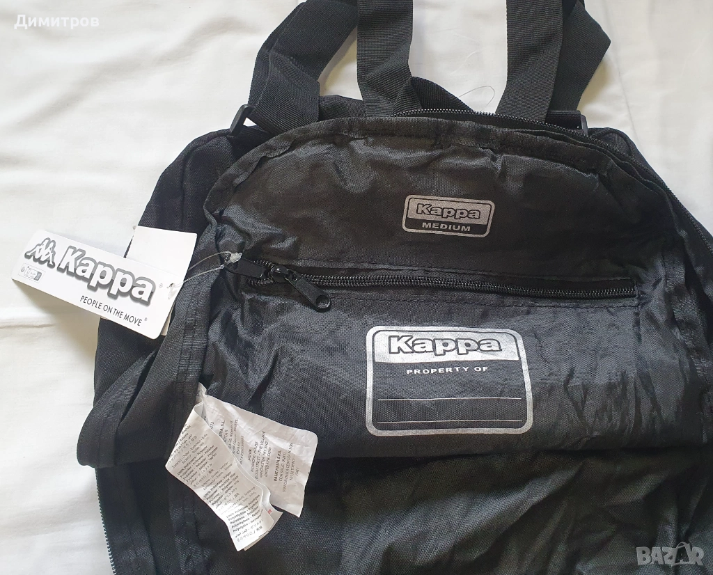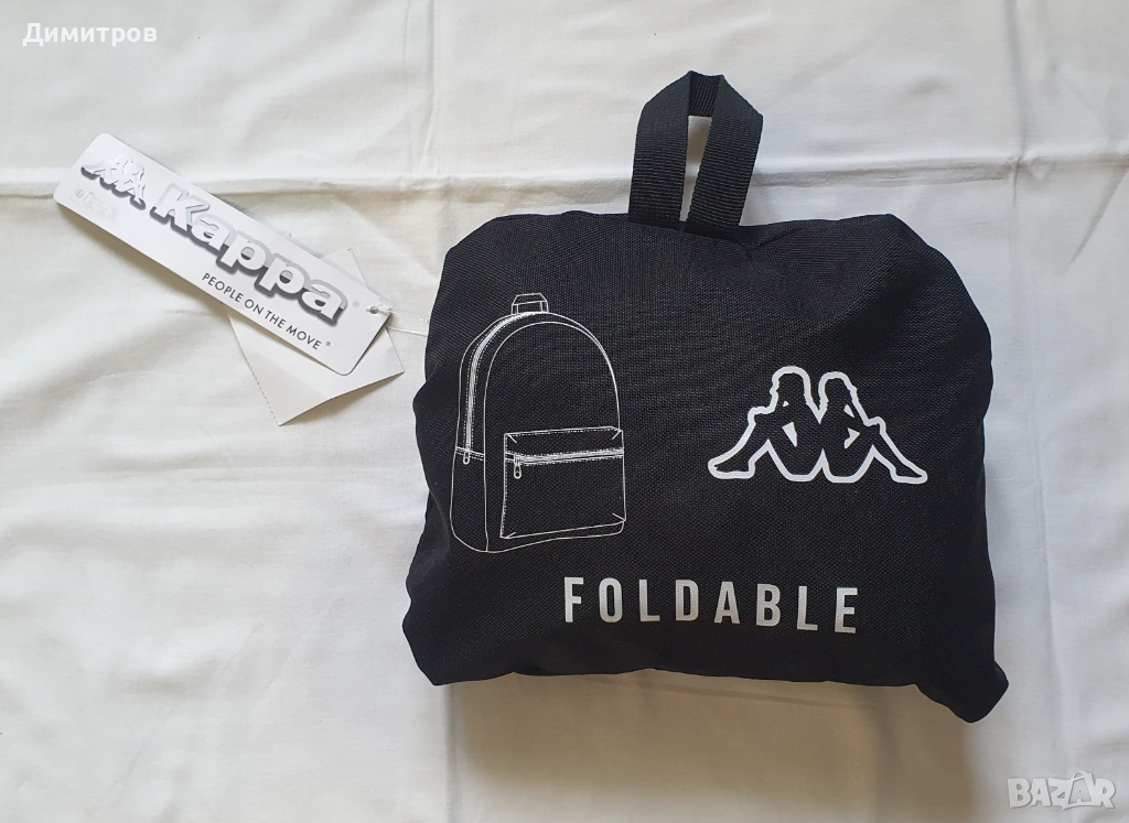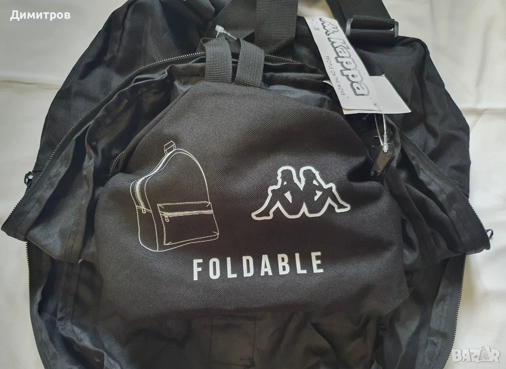 1. Раница Kappa - нова, с етикет. Цвят - черен. Размери - 39см х 29см х 14см. От вътрешната страна, на гърба, има джоб със цип, в който се побира цялата раница, и става компактна малка чанта - виж снимките.