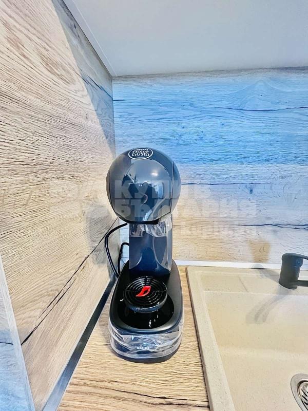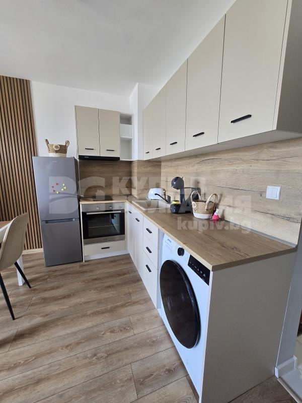 Напълно оборудвана кухня с чисто нови уреди (фурна с котлони, хладилник, пералня+сушилня, кафемашина) всички са в гаранция и неизползвани.