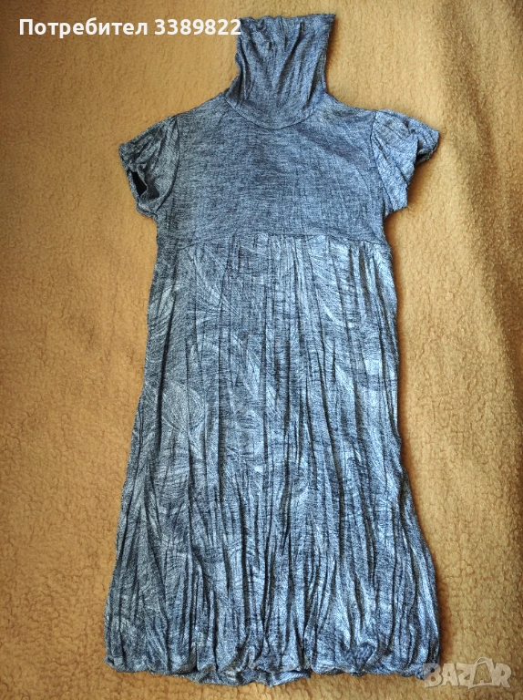 Рокля - сив цвят, къс ръкав, поло яка, дължина от рамото до долу 86см, гръдна обиколка едностранно 40см, размер М.