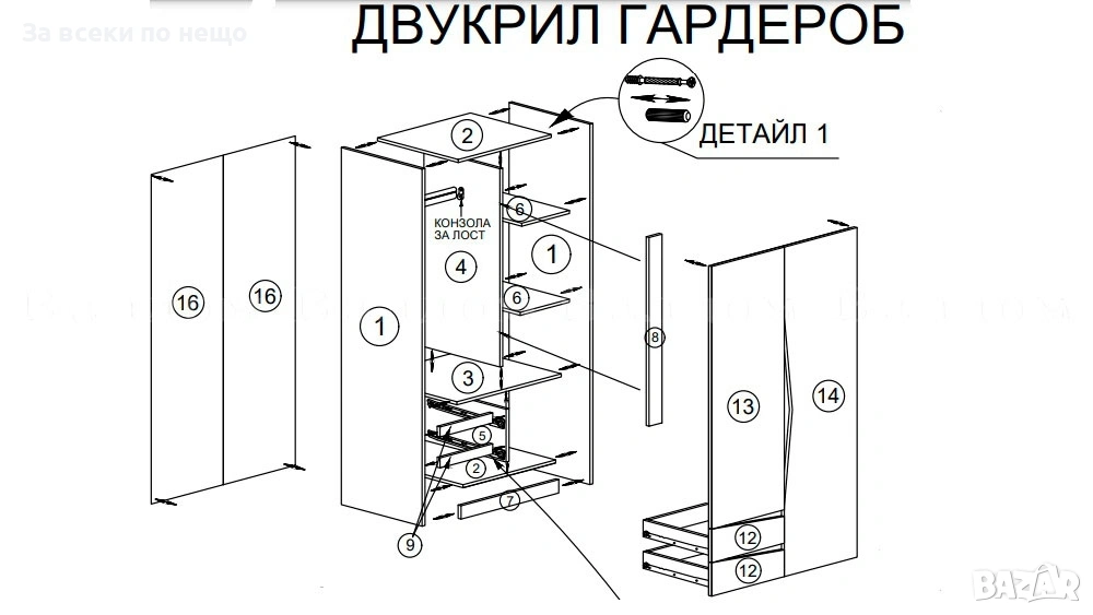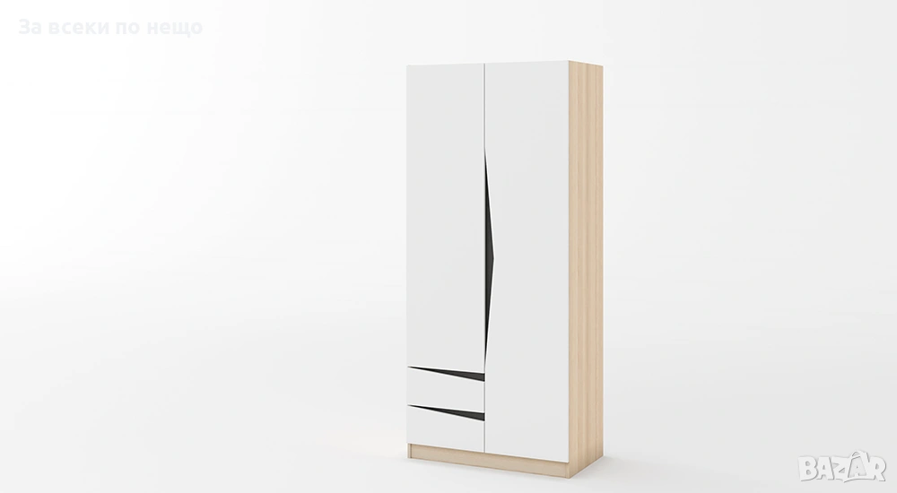 Двукрилен гардероб с 2 чекмеджета, 3 рафта и лост - 900/520/2050 мм