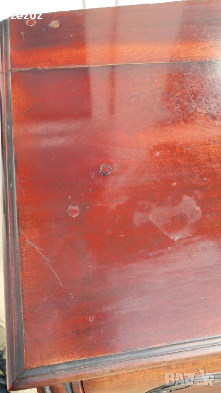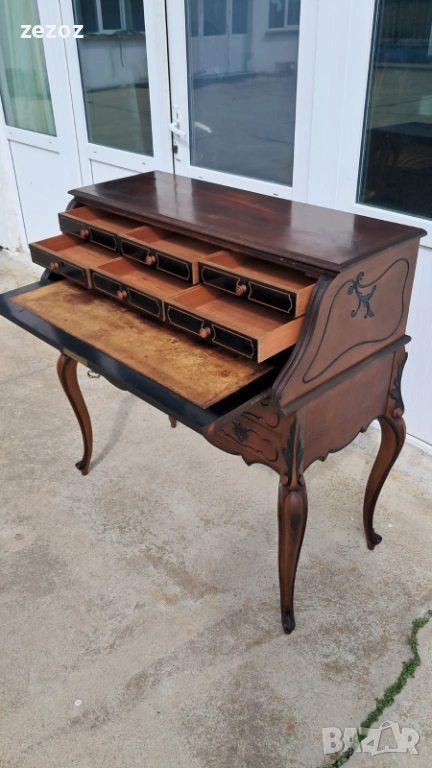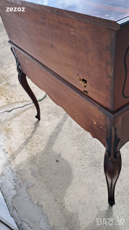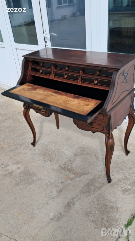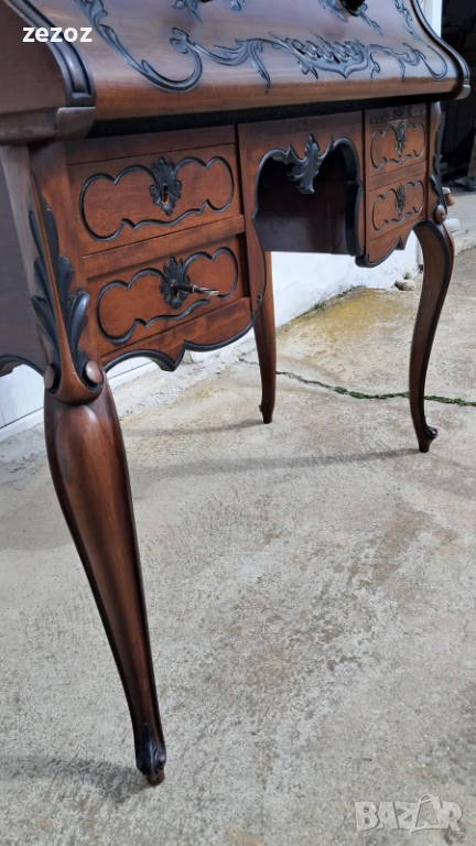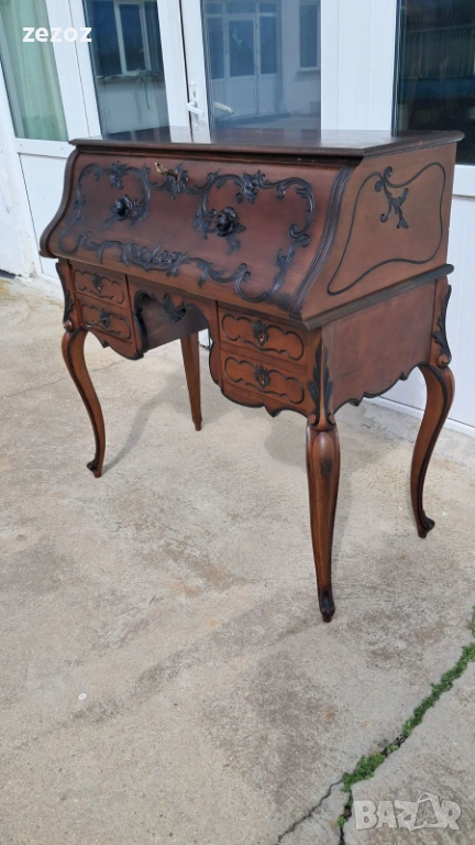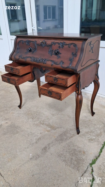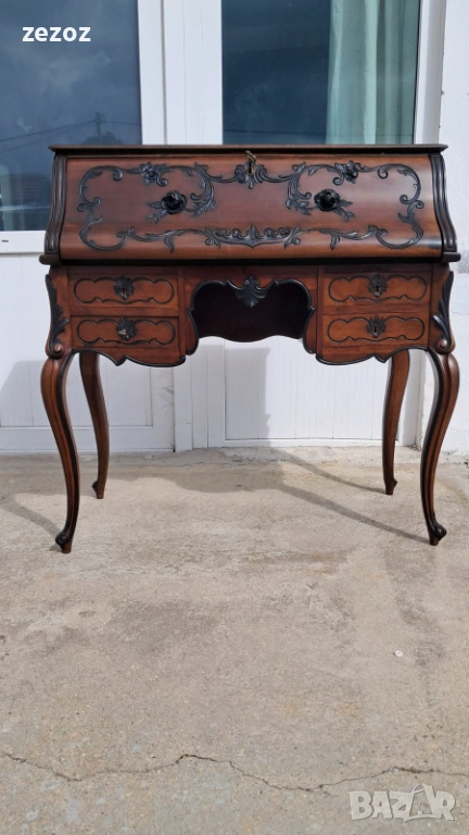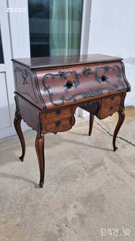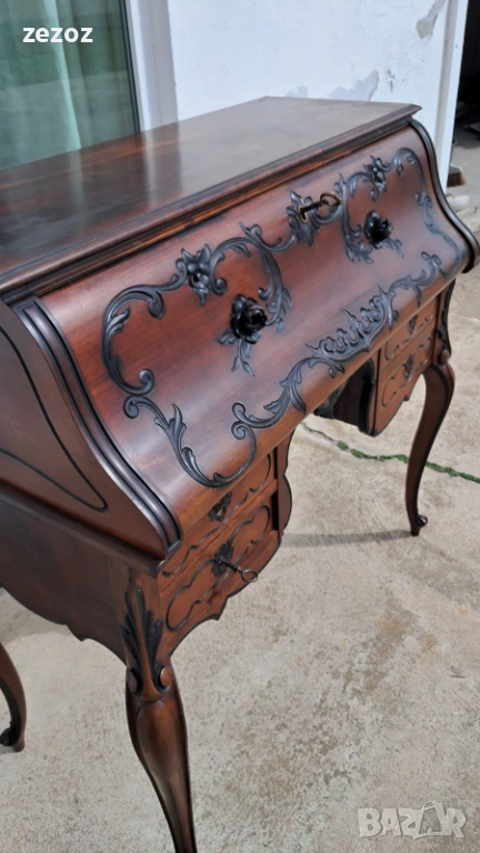 Много красиво и изящно дамско ретро бюро,изработено от качествен плътен махагон.Възпроизвеждане на стил "Рококо" от средата на 20 век.Извити финни пропорции,грациозни крака тип "кабриол".Богата дърворезба по извития падащ плот,чекмеджетата и страниците.Дръжките са оформени като цвете.Кожен плот с патина.Два ключа.На ключалките има маркировка на производителя на обкова.За годините си е добре запазено и конструктивно здраво.Имало е някаква горна част,отворите са запълнени.Както и изрязано на гърба за кабели,но пък се вигда ясно,че и той е от плътен масив.Размери-