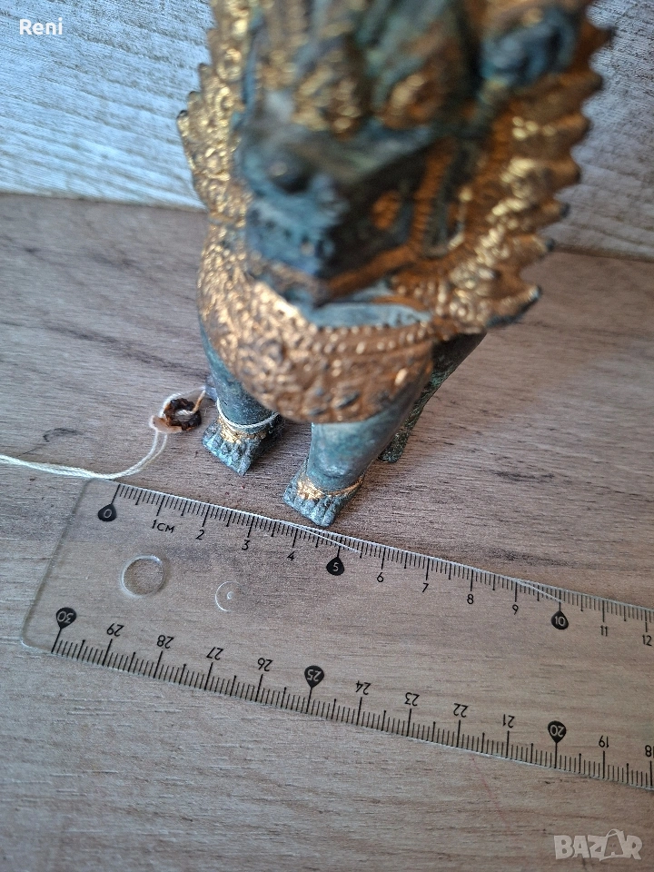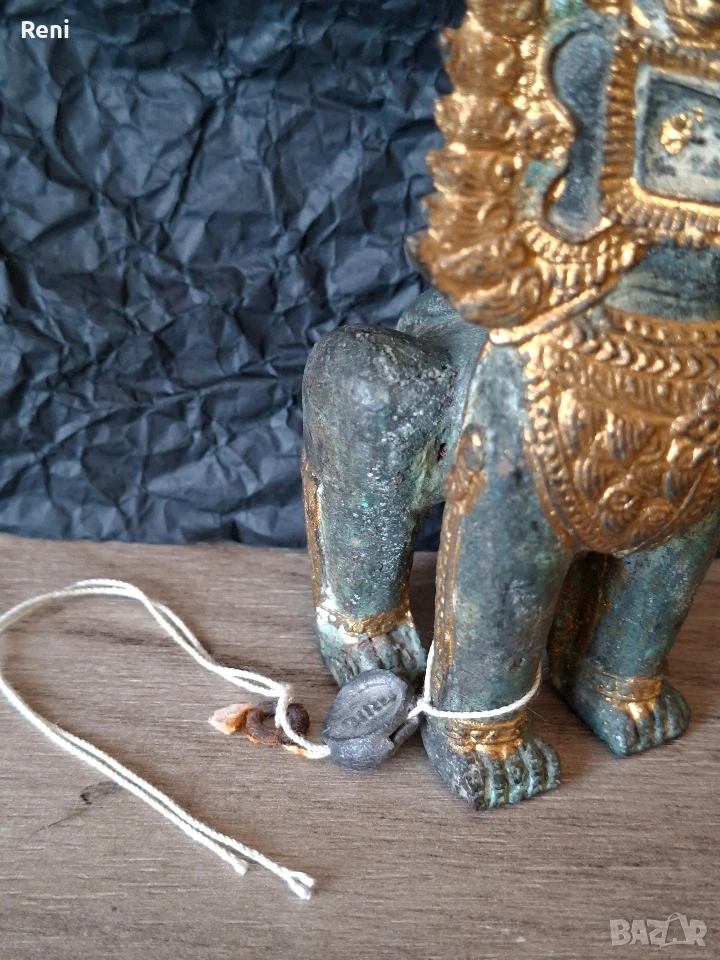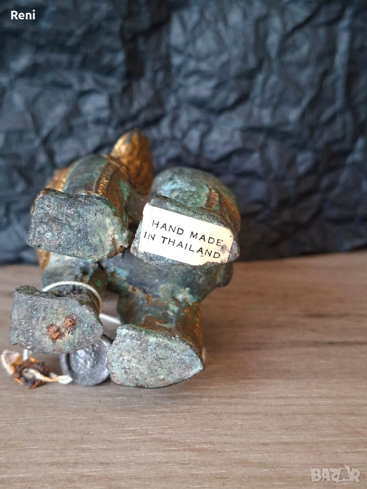 Автентична и много стара статуетка от истински бронз с марка, ръчно изработен. Висок е 11-12 см., тежък и масивен, не е кух. Намерен в стара къща, донесен преди много години от Тайланд.