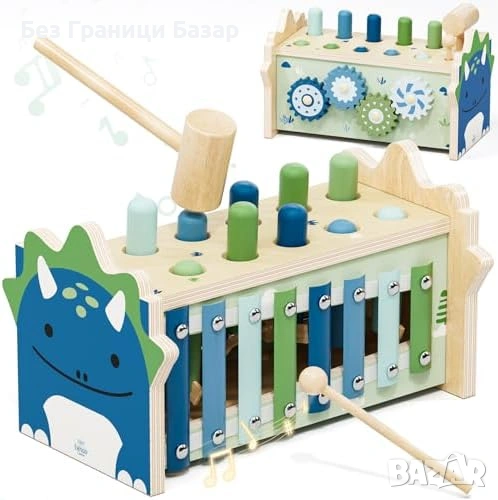 Дървена Montessori играчка с чукче, зъбни колела и цветен ксилофон