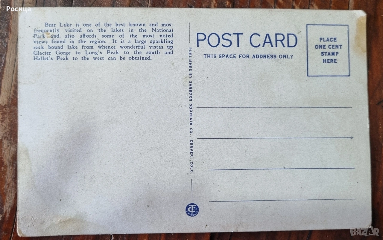 Пощенска картичка от Колорадо изобразяваща езерото Беър Лейк и връх Лонгс Пийк