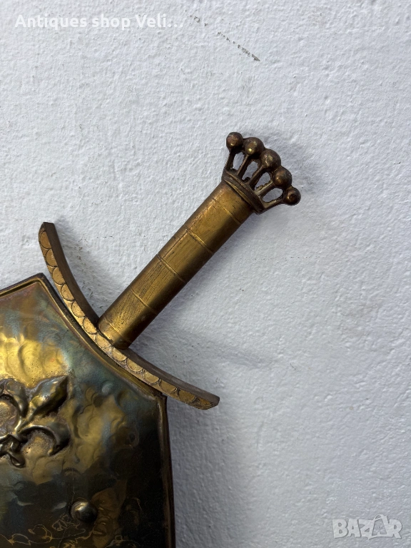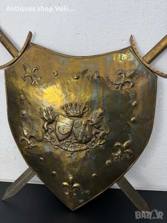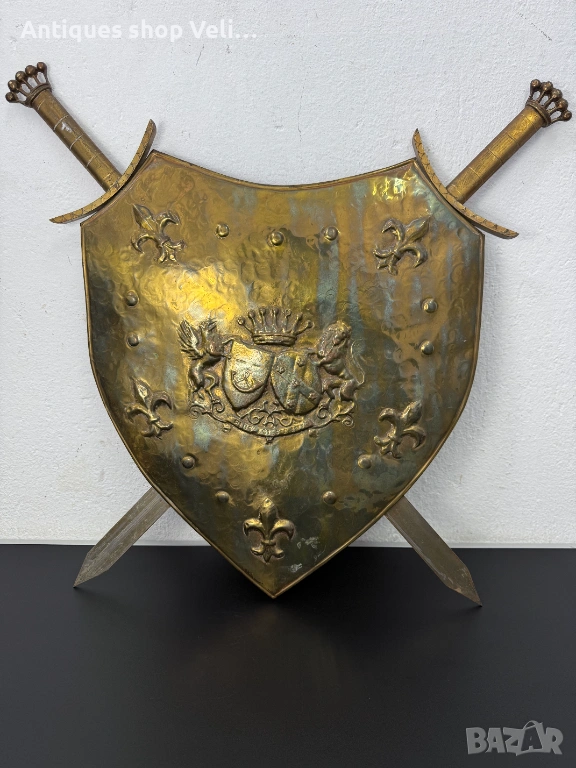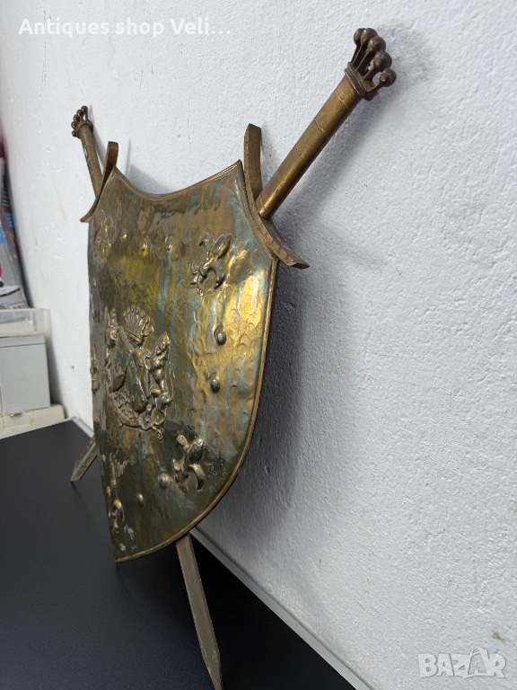 Декоративен бронзов шит за срена с релефен герб и мечове. Много добро състояние. Предлагаме доставка с Еконт и лично предаване за градовете Велико Търново, Русе и Сливен!