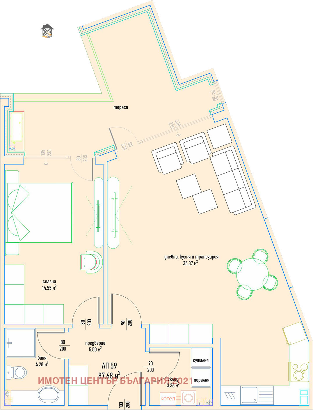 105.12м2 и с разпределение: антре, просторна дневна с кухненски бокс и трапезария-35,37м2, спалня-14,55м2, баня с тоалетна, мокро помещение и тераса.