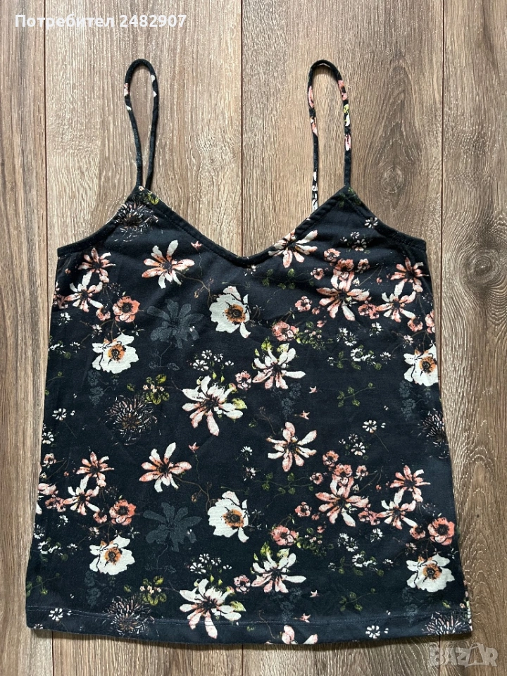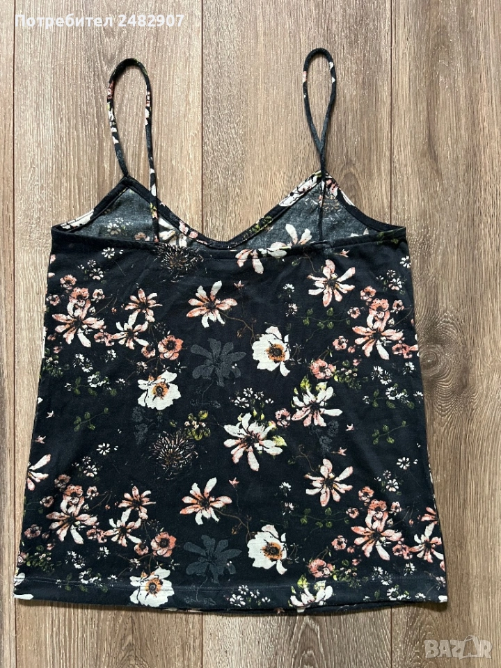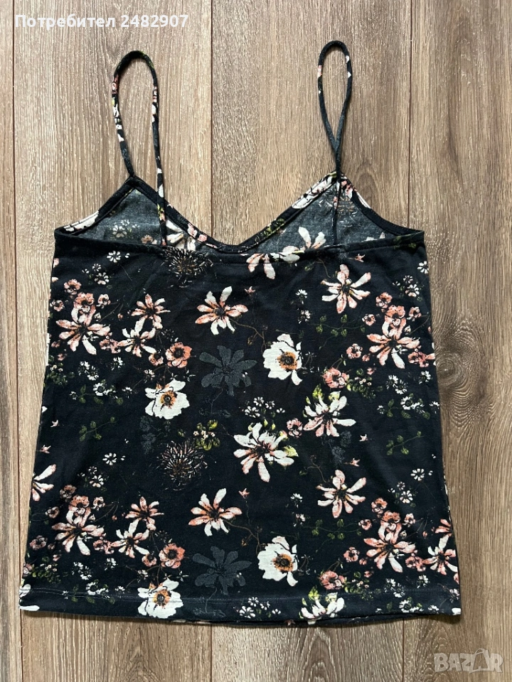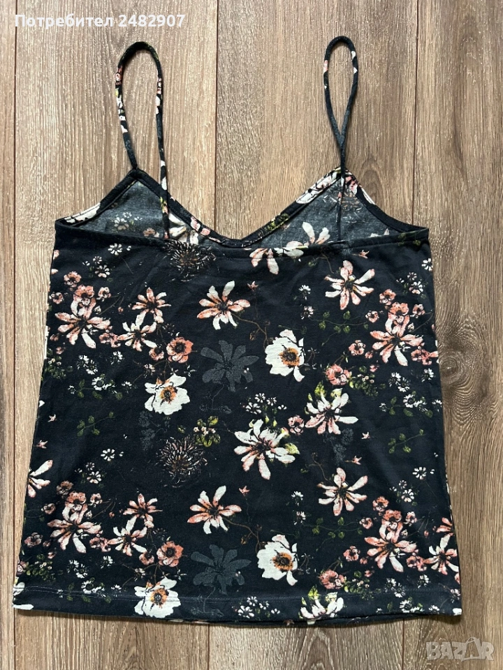 Черен дамски потник с флорални мотиви, размер 34. Съдържа 100 % полиестер. Ширина под мишниците - 37 см, ширина в долната част - 44,5 см, дължина от горната част на презрамките до долу - 58 см. Много запазен, почти не е използван.