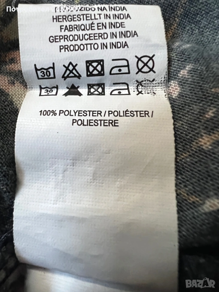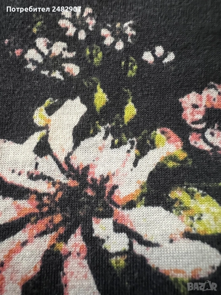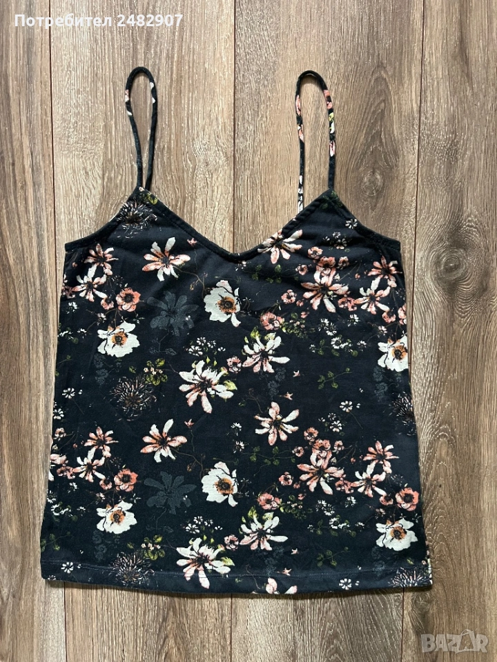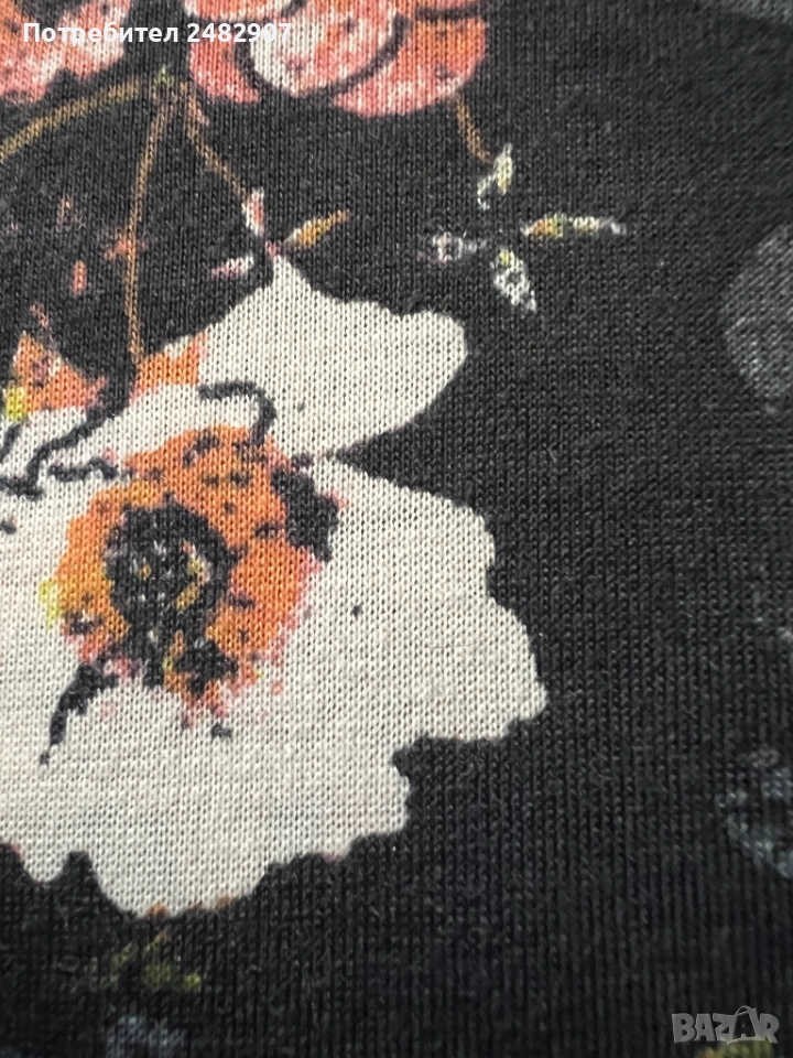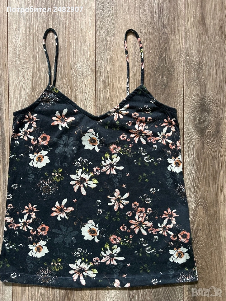 Черен дамски потник с флорални мотиви, размер 34. Съдържа 100 % полиестер. Ширина под мишниците - 37 см, ширина в долната част - 44,5 см, дължина от горната част на презрамките до долу - 58 см. Много запазен, почти не е използван.
