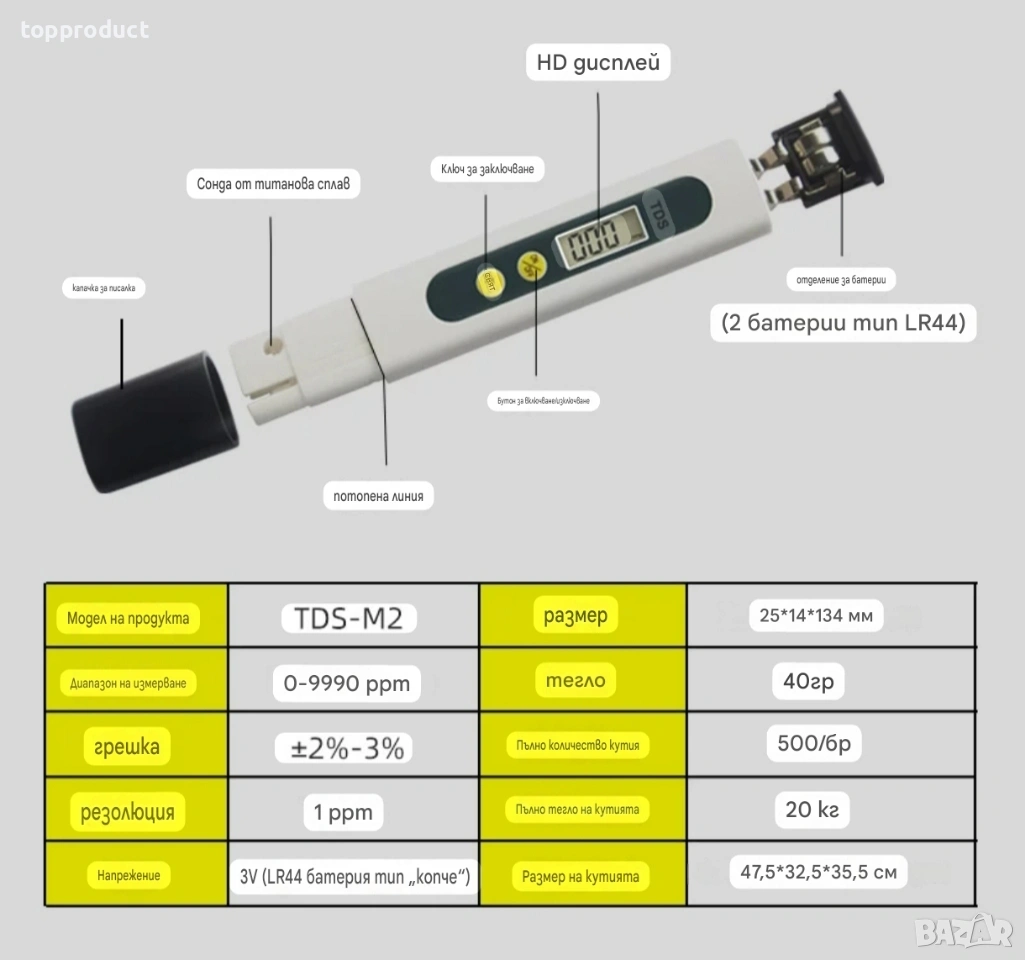TDS тестер за качеството на водата, снимка 1 - Лаборатория - 54042752 TDS тестер за качеството на водата, снимка 2 - Лаборатория - 54042752 TDS тестер за качеството на водата, снимка 3 - Лаборатория - 54042752 1/3