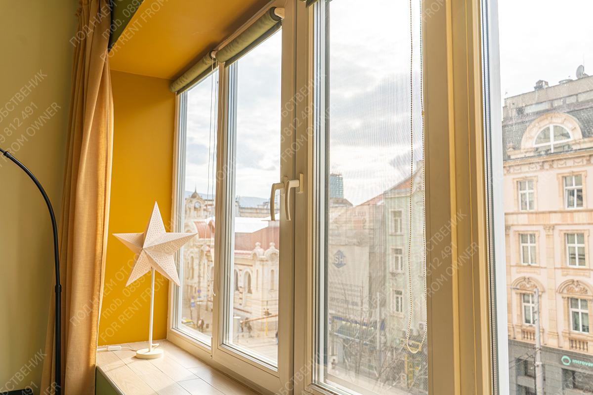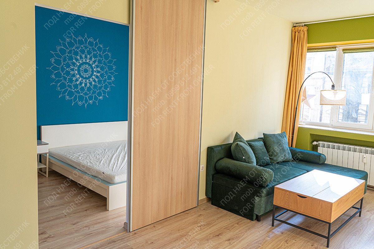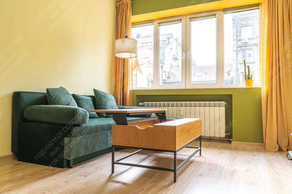 FROM OWNER, after overhaul - TOP CENTER LOCATION! Luxury and cozy apartment. New plumbing, electricity, internet + router + IP Camera for CCTV. Floors: granite - kitchen and corridor, laminate - living room and bedroom. Custom kitchen furniture, built-in wardrobe, sliding door. White appliances: laundry, fridge, built-in oven and ceramic hob, absorber, microwave. Mounted lighting - diode lighting: corridor, bathroom, kitchen. Bathroom - PVC commode, electric towel heater, new sanitary, new tiles. New solid external door with high security lock. Furniture: dining table + 4 chairs, sofa, coffee table, TV table, bed (without mattress) + 2 night stands. Very cosy and warm apartment. Suitable for office or living. 550 BGN (for 2 year contract) 600 BGN for 1 year contract.