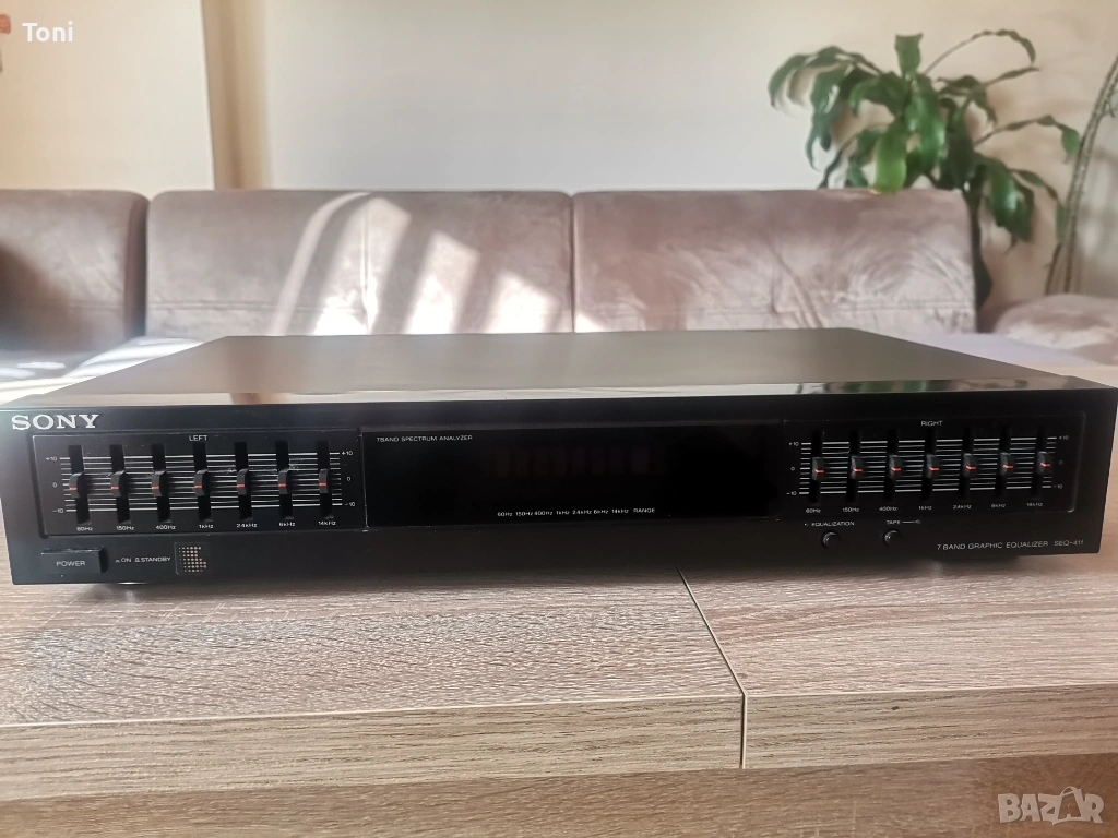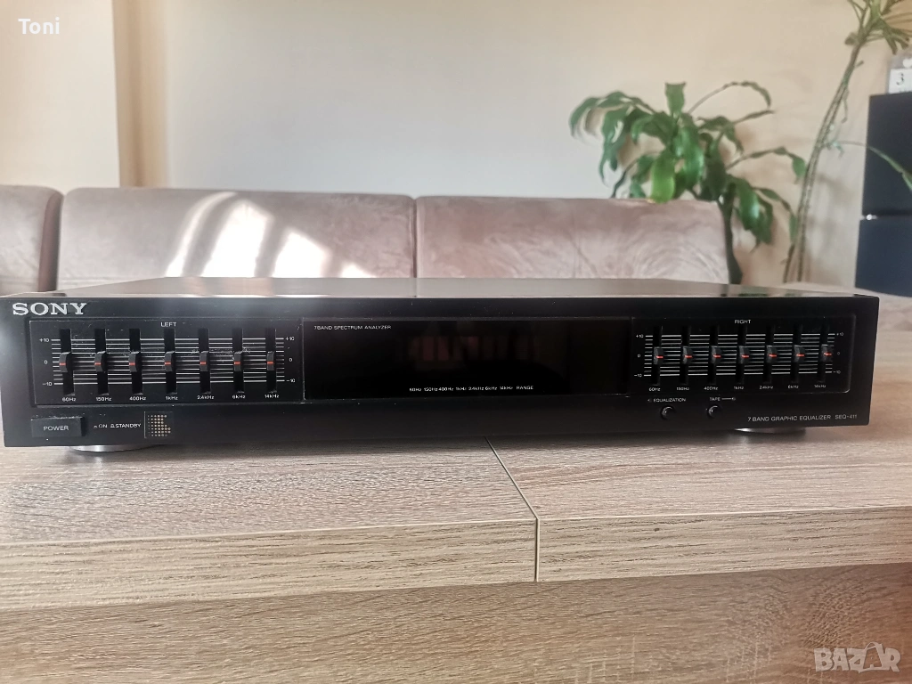 Продавам еквалайзер Sony seq-411 в перфектно техническо състояние. Преден панел без забележки челно но отгоре има забележки. Счупени са и зъбчетата които придържат капака. Не е фрапиращо и не пречи на работата. Не се вижда когато отгоре има друга техника. Дисплей и всичко друго е ок. Предпочитам лично, но може да го пратя и по Еконт.